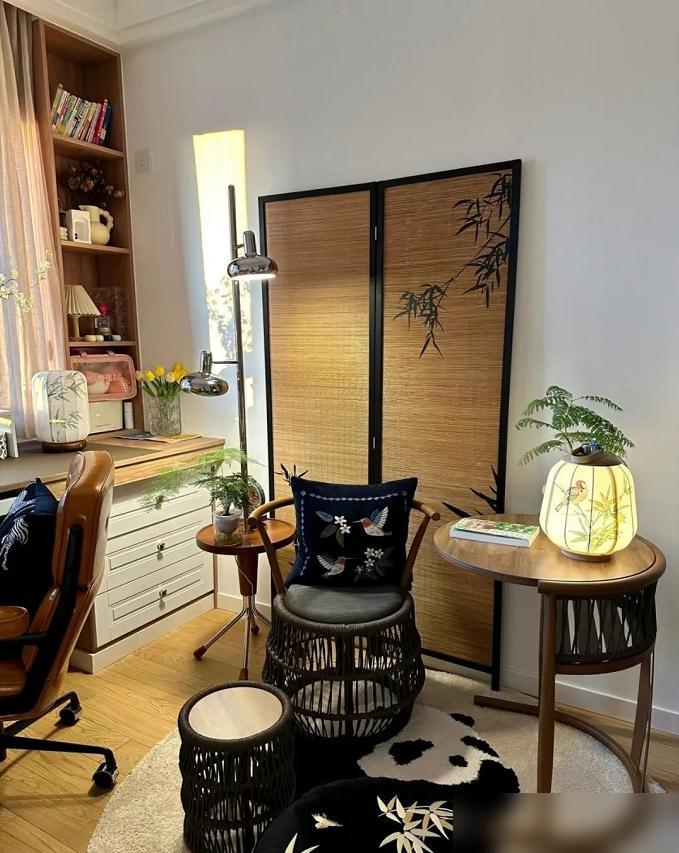最让人挪不开眼的,就是那个屏风。原木打底,配上翠竹,国风的魂一下就出来了。这玩意儿放对了地方,就是整个空间的定海神针。它不光是隔断,更是一幅立体的画,把书卷气和艺术感稳稳立在那儿。