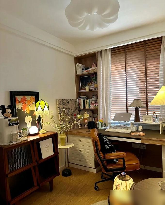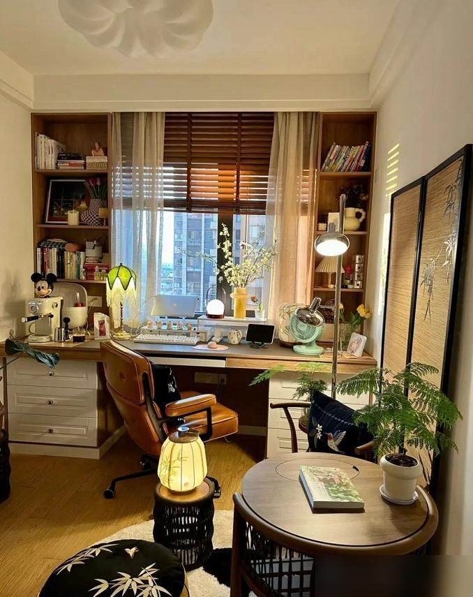 墙面的架子利用得充分。书和摆件错落着放,既实用又好看。那个灯笼造型的台灯是点睛之笔,昏黄的光一打,氛围感拉满。窗帘更是用心,木质百叶帘加一层薄纱,光线滤得柔和又朦胧。这种光影游戏,花不了多少钱,效果却出奇地好。
