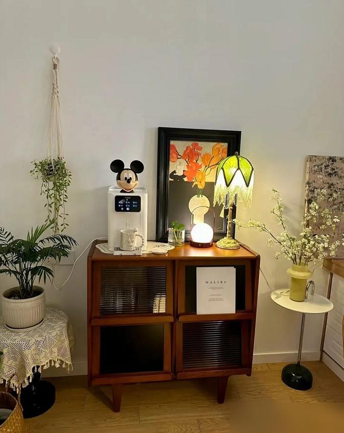 熊猫地毯添了份俏皮,深色收纳柜又压住了阵脚,让空间不至于飘。边几上摆两盆绿植,绿意盎然,沉闷感一扫而空。看得出主人是懂生活的,每样东西都挑了又挑,有自己的脾气。