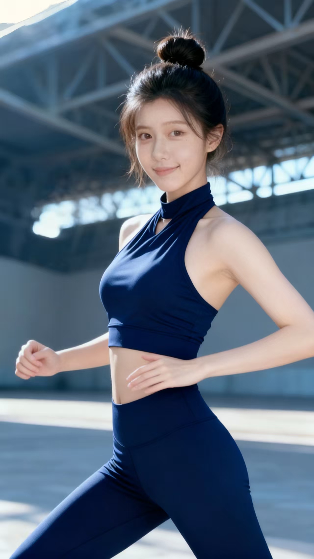 在阳光的映衬下,运动服的材质呈现出细腻的光泽感,面料紧贴身体却不紧绷,随着动作的舒展自然起伏,展现出力量与柔韧的结合。她的动作充满活力与节奏感,每一次摆臂、每一次抬腿都传递出健康的气息与运动的美感,仿佛将阳光与活力都穿在了身上。