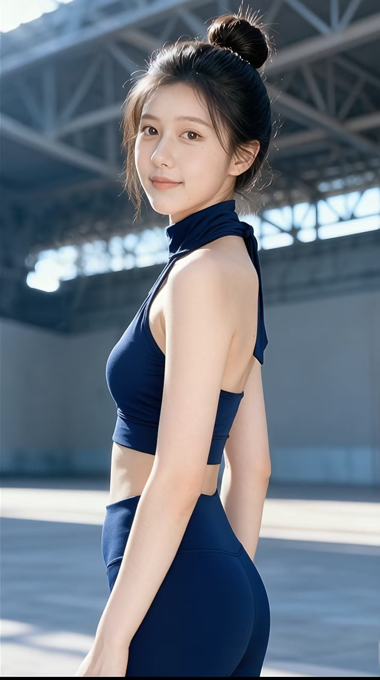 她身着藏蓝色运动套装,上装为高领挂脖式短款运动背心,领口的交叉设计既时尚又贴合颈部曲线,露出流畅的肩颈线条与紧实的腹部肌肉;下装是高腰紧身运动裤,完美包裹腿部线条,勾勒出饱满的臀型与修长的腿型。