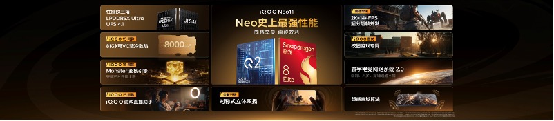 iQOO Neo11搭载由骁龙8至尊版与自研电竞芯片Q2组成的“旗舰电竞双芯”,配合Monster超核引擎,实现1% Low帧表现、PC级2K纹理超分、原生144FPS无损超帧及超分超帧并发,支持40+款游戏原生144FPS。通过KPL比赛用机认证,并首批适配《王者荣耀》原生144FPS模式。Neo11还与《暗区突围》深度合作,支持全地图光线追踪,立体双扬声器与4D游戏振感进一步增强沉浸感。