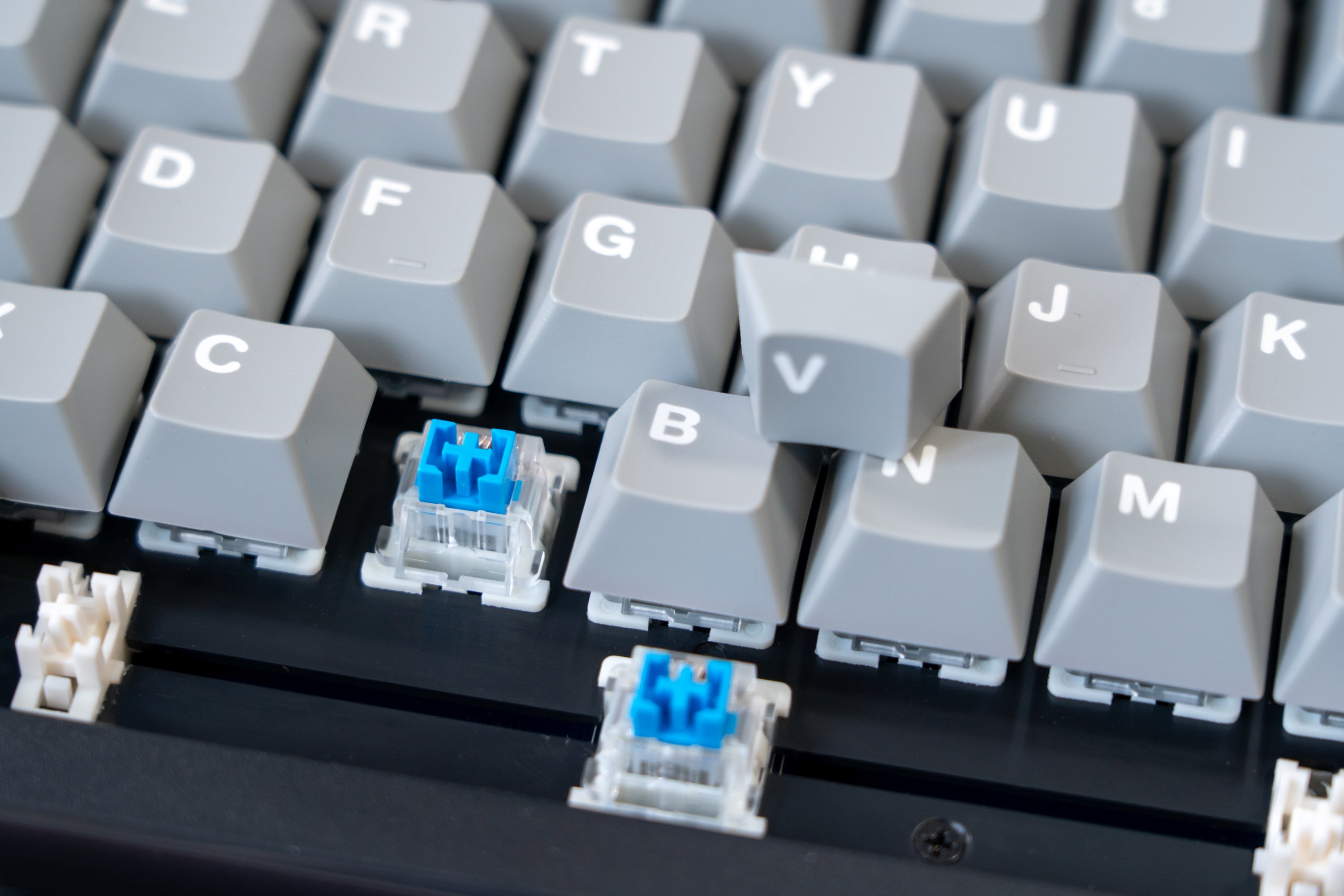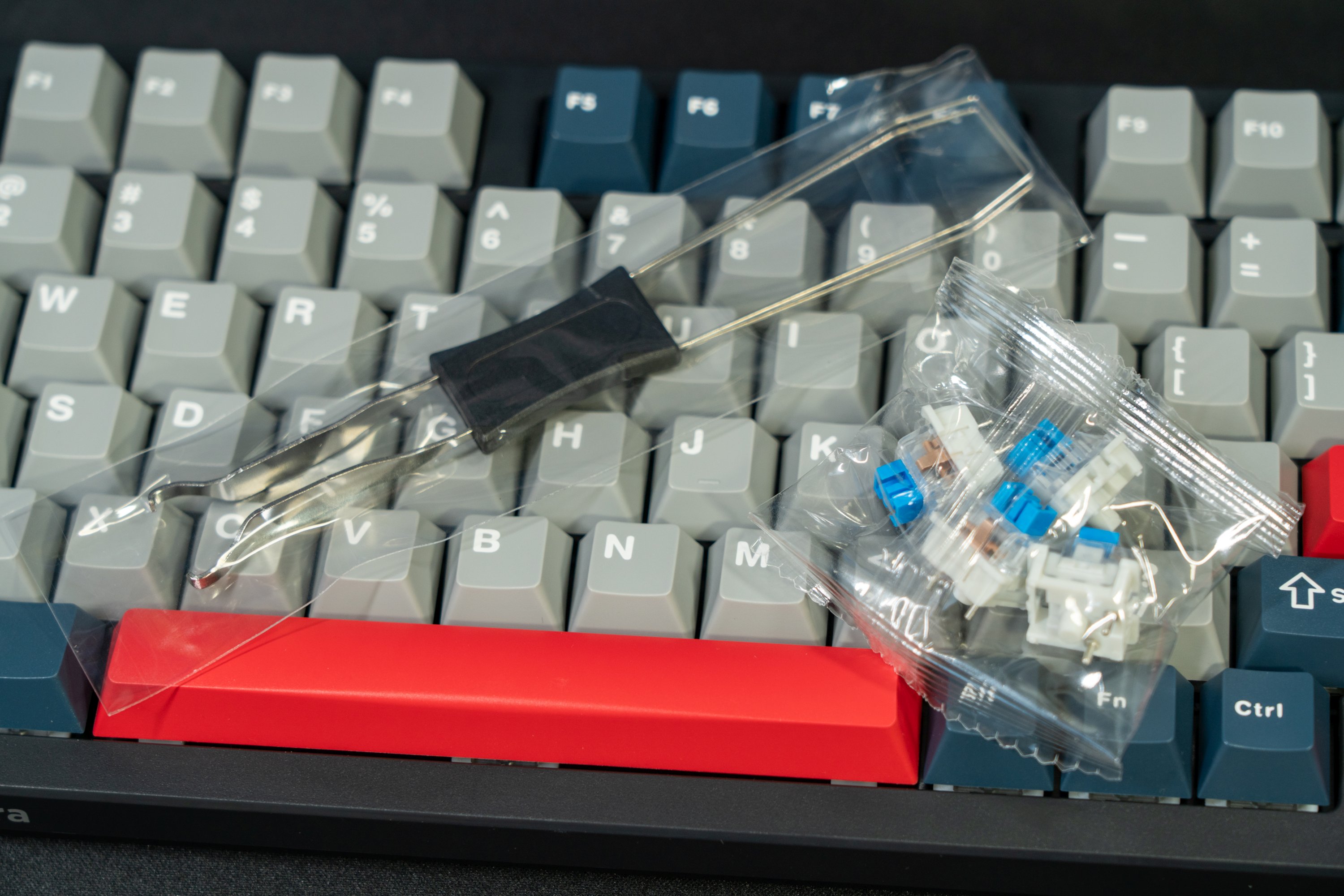 虽然定价不高,但这款键盘依旧支持了全键热插拔,方便玩家可以随时替换自己喜欢的轴体。笔者手上的是青轴版本,轴体来自LIANC,包装内不仅包括了拔轴器,同时还有4个额外的用于替换的轴体。手感方面就不多说了,典型的青轴风格,声音清脆段落感强,回弹顺滑没有卡滞感,围墙轴芯结构设计提供了不错的稳定感。比较遗憾的是,这款键盘没有做消噪设计,使用时有少许的杂音。