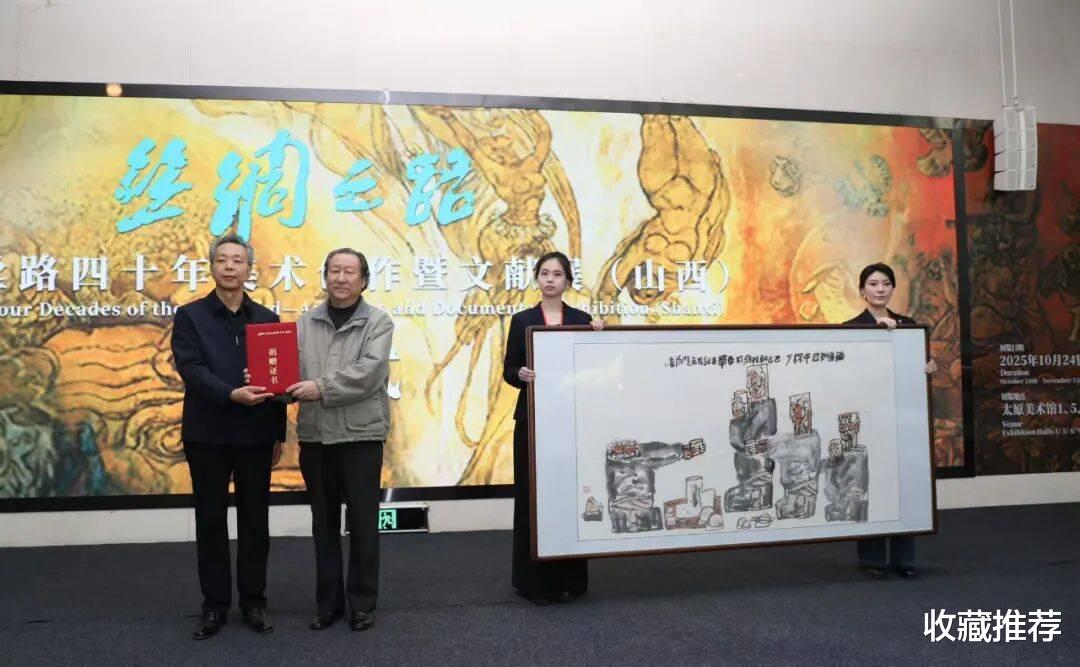 在捐赠仪式上,中国文化艺术发展促进会主席、中国国家画院原院长杨晓阳先生向太原美术馆(太原画院)捐赠了其代表作品,由太原美术馆馆长、太原画院院长殷卫东接受捐赠并颁发收藏证书。体现了艺术家对山西文化事业的支持,其作品将成为太原美术馆的永久珍藏,惠及公众。