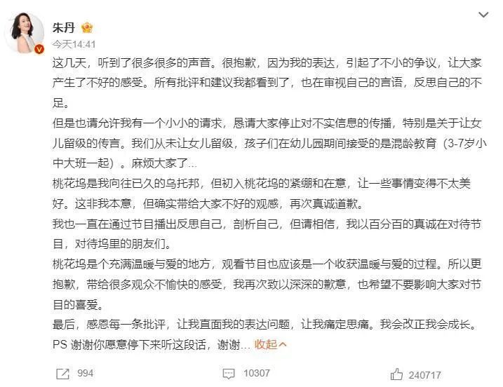 朱丹因在综艺节目《五十公里桃花坞》中的一系列言论陷入舆论风波,甚至传出了她“刻意让女儿留级照顾弟弟”的说法。