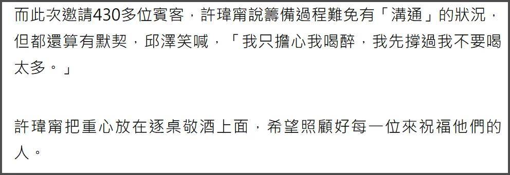 结婚快 4 年,邱泽和许玮甯终于把补办婚礼安排上了!这场婚礼直接惊动大半个台娱圈,430 多位宾客到场庆贺,场面热闹得堪比 “三金” 颁奖礼,虽然全程不对外直播,但那些藏不住的甜蜜细节,还是让网友直呼 “磕到了”!