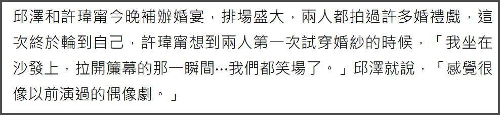 婚礼当天,邱泽搂着许玮甯亮相,平时在镜头前挺沉稳的他,居然紧张到脸颊通红,手足无措的样子反差感拉满。许玮甯倒显得大方又亮眼,笑着跟媒体打招呼,状态好到发光。聊起第一次试婚纱的经历,两人都忍不住笑出声,邱泽一脸认真地说 “感觉跟拍戏似的,有点不真实”,语气里的宠溺都要溢出来了。