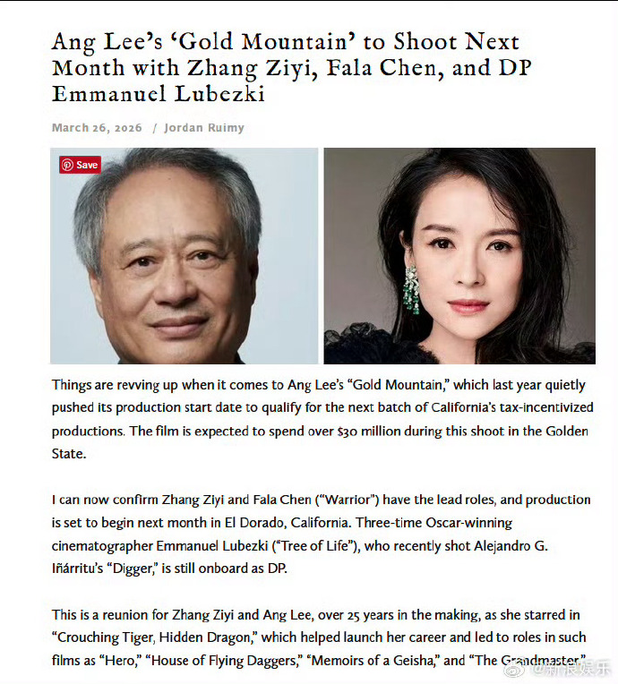 3月27日海外传来重磅消息:李安导演确认和章子怡再度合作,全新电影《金山》(Old Gold Mountain)定档今年4月,正式在美国加州开机拍摄。