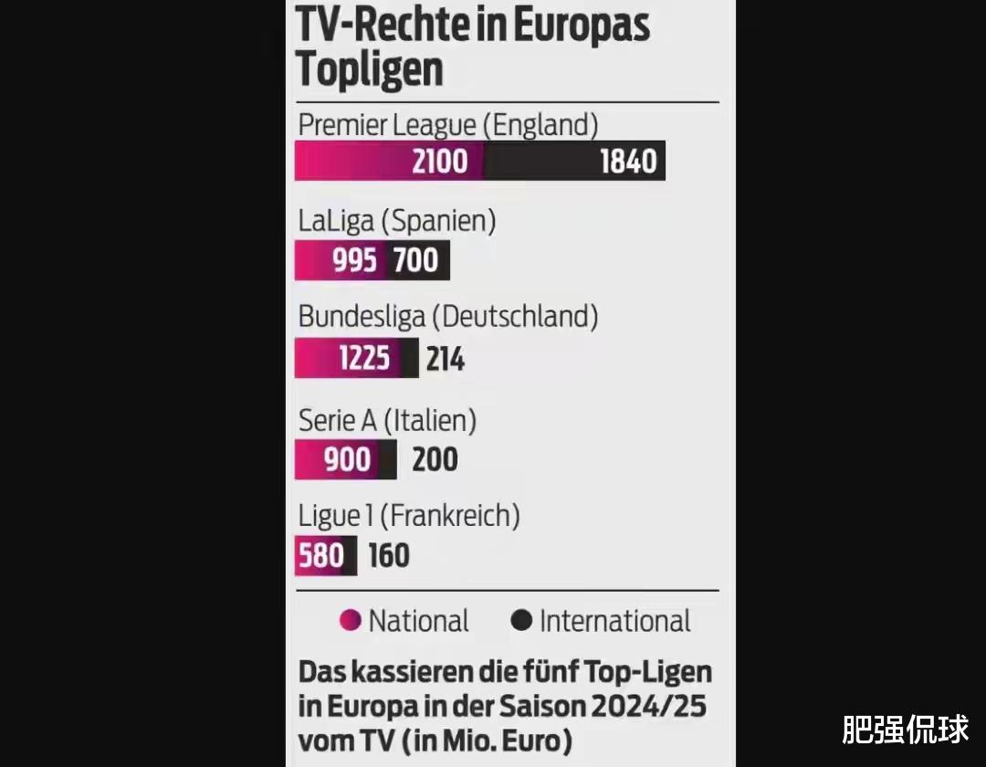 如果说更加直观的数据就是转播收入,我们以2024/25赛季为例,英超的国内转播21亿欧、海外转播18.4亿欧共计39.4亿欧,在五大联赛中遥遥领先。西甲国内9.95亿欧、海外7亿欧合计16.95亿欧排在第二,德甲国内12.25亿欧、海外2.14亿欧合计14.39亿欧排在第三,曾经贵为世界第一联赛的“小世界杯”意甲只有国内9亿欧、海外2亿欧合计11亿欧,排在第四位,只比没什么存在感的法甲高一些而已。特别是海外转播权,意甲只有2亿欧,是西甲的28.6%、英超10.9%!