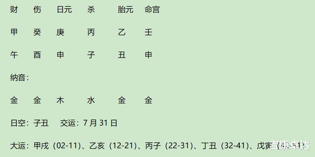 此月,壬食透而生财、财生杀,午与命宫申夹未,午未冲子丑。