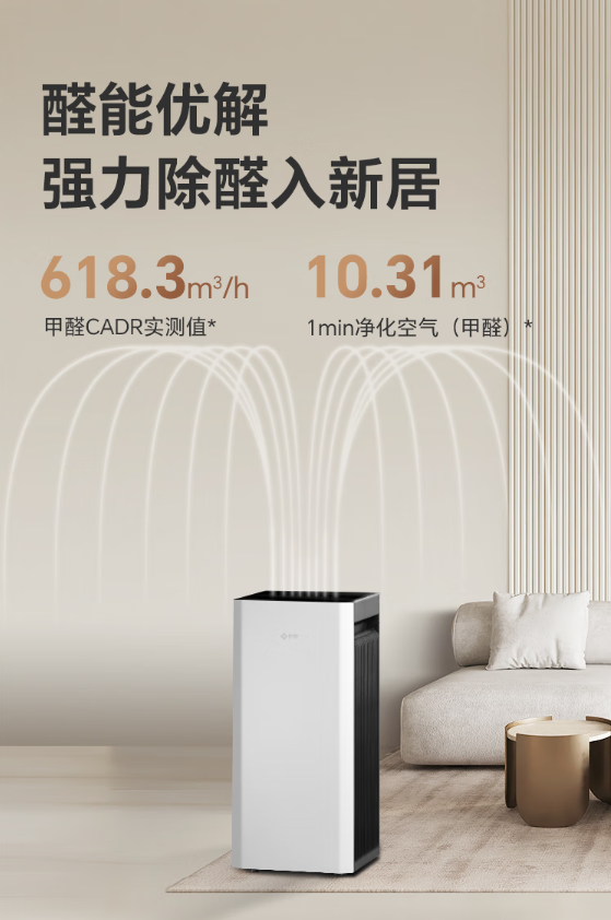 同时,它的TVOC去除率达93.5%,除臭性能为97.9%,冠状病毒去除率高达99.99%,花粉去除率99.19%,猫皮屑过敏原去除率98.87%。此外,颗粒物CADR实测值为839.9m³/h,适用面积达95m²,大户型也能快速实现空气循环净化。