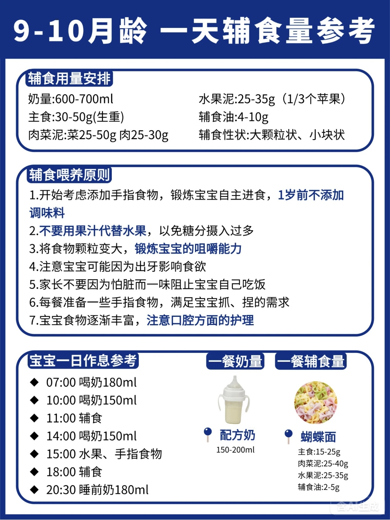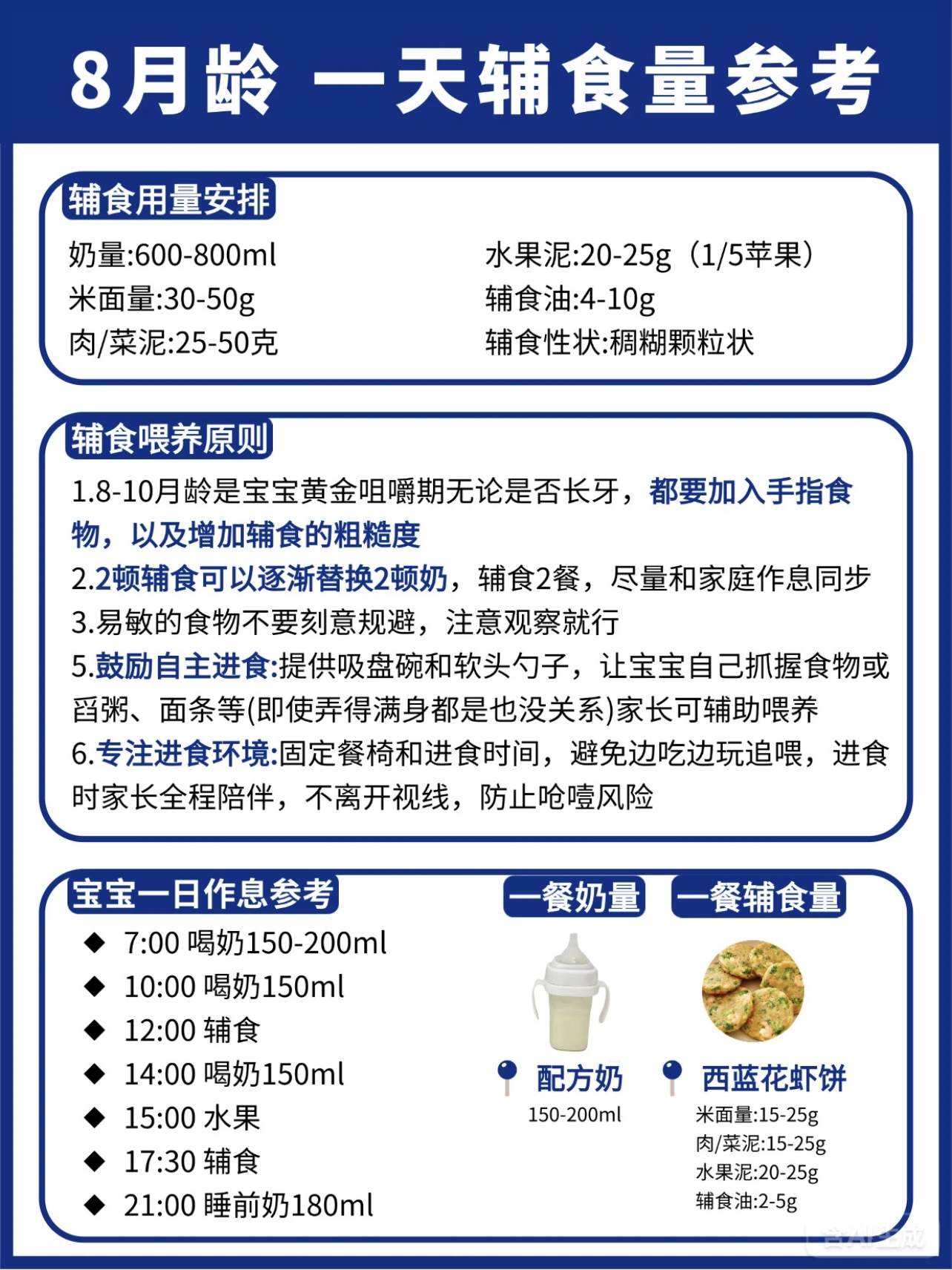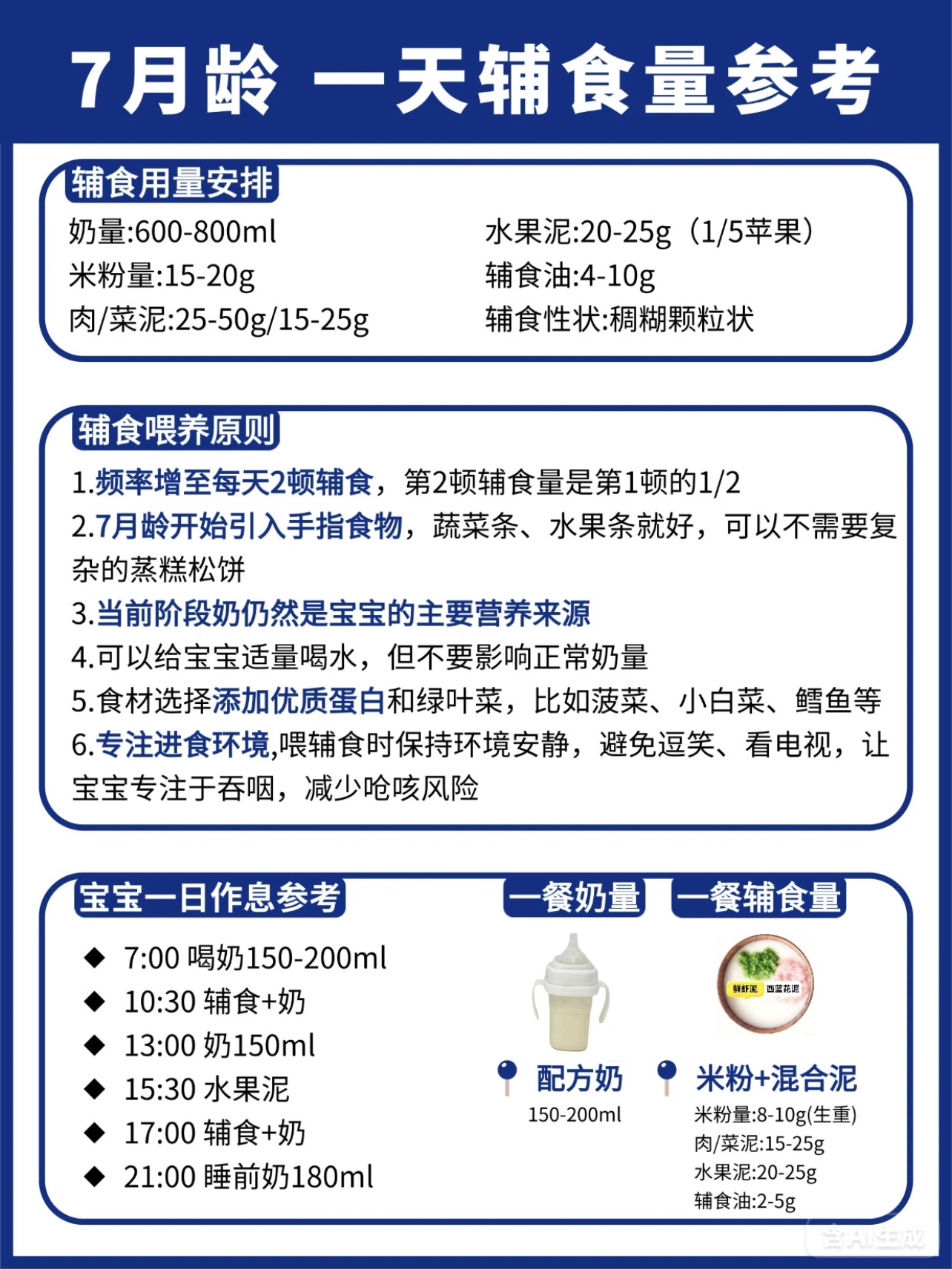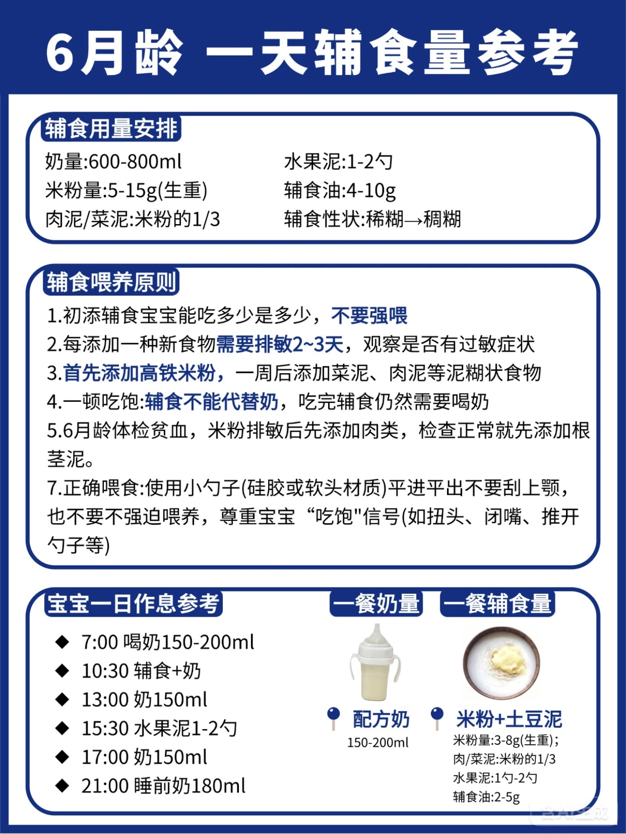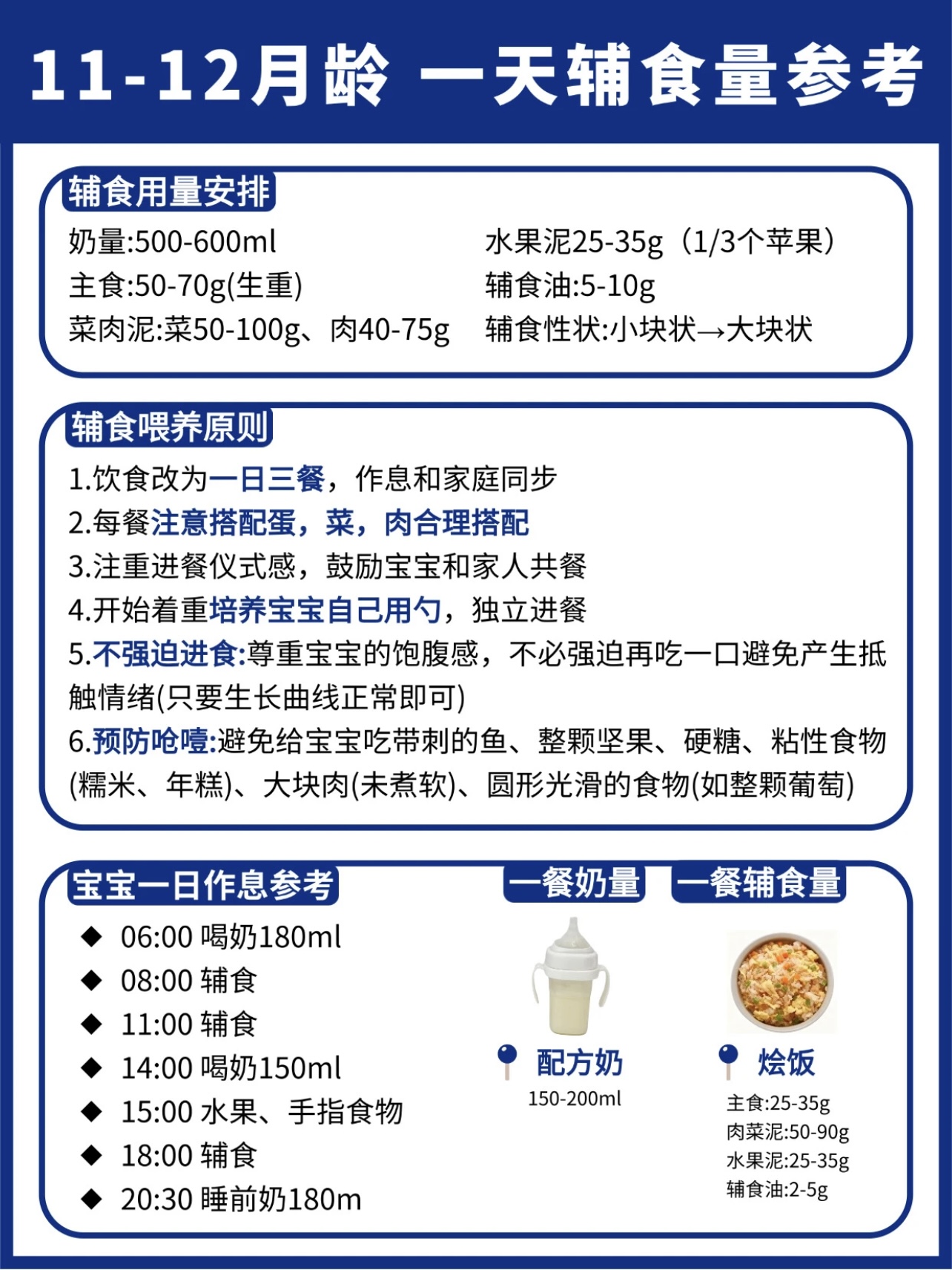 6月龄:700-800ml/天,辅食1次(上午)稀糊状,食材可以采用强化铁米粉、根茎类蔬菜泥(如胡萝卜、南瓜)、水果泥(如苹果、香蕉),辅食添加时间可以在上午10点:5g米粉+30ml水→逐渐加至10g;下午3点:母乳/配方奶。7月龄:700-800ml/天,辅食2次(上午+下午)稠糊状,食材可以十倍粥、蛋黄粥、碎面条、禽肉泥(如鸡肉、鳕鱼),添加时间可以上午10点:15g米粉+蔬菜泥;下午3点:碎面条+肉泥;睡前:母乳/配方奶。8月龄:700-800ml/天,辅食2次(上午+下午)软颗粒状,食材蛋黄(从1/4开始加)、红肉泥(如猪肉、牛肉)、动物肝脏(每周1-2次)、手指食物(如蒸南瓜条、香蕉块),辅食添加时间就没用过上午10点:稠粥+肉松;下午3点:蛋黄+蔬菜碎;加餐:手指食物。9-10月龄:700-800ml/天,辅食2次(上午+下午)+1次加餐,食材就没用过小颗粒状稠粥、软饭、烂面条、蛋羹、鱼肉泥、虾肉泥、粗纤维蔬菜(如西兰花、豌豆),添加时间上午10点:软饭+肉末+蔬菜;下午3点:蛋羹+水果;加餐:米饼/溶豆。11-12月龄:600-800ml/天,辅食3次(早中晚)+1次加餐,食材可以块状/固体软米饭、小馄饨、包子、鸡蛋饼、干贝、银鱼、蛋清(1岁后加),添早餐:软米饭+肉末炒菜;午餐:小馄饨+蔬菜汤;晚餐:鸡蛋饼+水果;加餐:酸奶/奶酪。