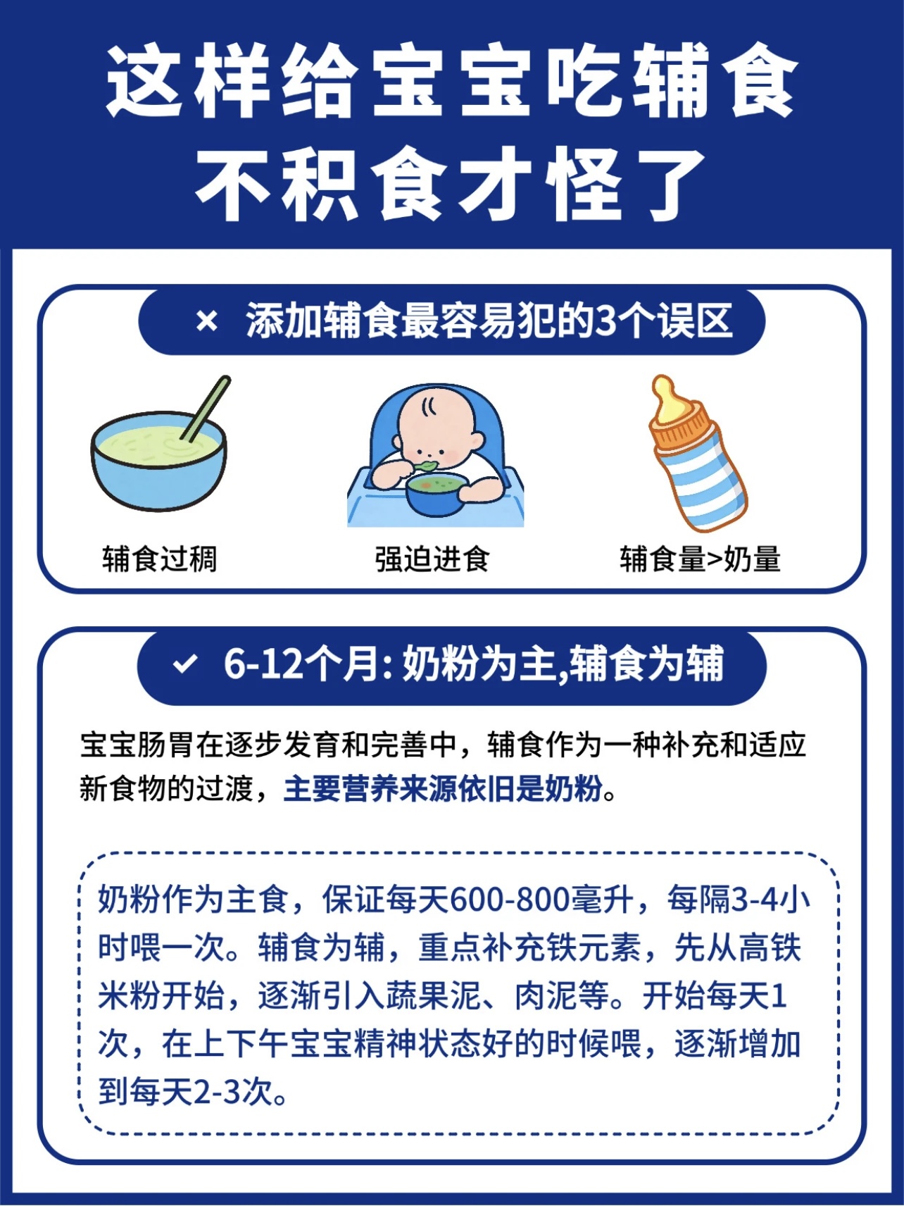 3个核心原则,喂养不踩坑!原则1:奶量是“底线”,辅食是“加分项”,6-12月龄宝宝每天仍需保证600-800ml奶量(1岁后降至400-600ml)。奶是蛋白质、钙的优质来源,辅食不能“喧宾夺主”。如果宝宝吃辅食后拒绝喝奶,可能是辅食量过多或质地太稠,需调整为“先奶后辅食”的顺序,或稀释辅食浓度。原则2:辅食添加“三看三慢”,看信号:宝宝能独坐、挺舌反应消失、对食物感兴趣时再添加(不早于4月龄,不晚于8月龄)。慢尝试:每种新食物吃满3天,观察是否过敏(如湿疹、腹泻、呕吐)。慢升级:从稀到稠(米糊→稠粥→软饭)、从细到粗(菜泥→菜碎→菜块)、从单一到混合(米粉→米粉+蔬菜→米粉+蔬菜+肉)。原则3:手指食物+自主进食,培养“干饭人”,8月龄后引入手指食物(如蒸胡萝卜条、软烂的西兰花),让宝宝自己抓握,锻炼手眼协调和咀嚼能力。10月龄后尝试用勺子,即使弄得满地都是也别急,这是学习吃饭的必经之路!