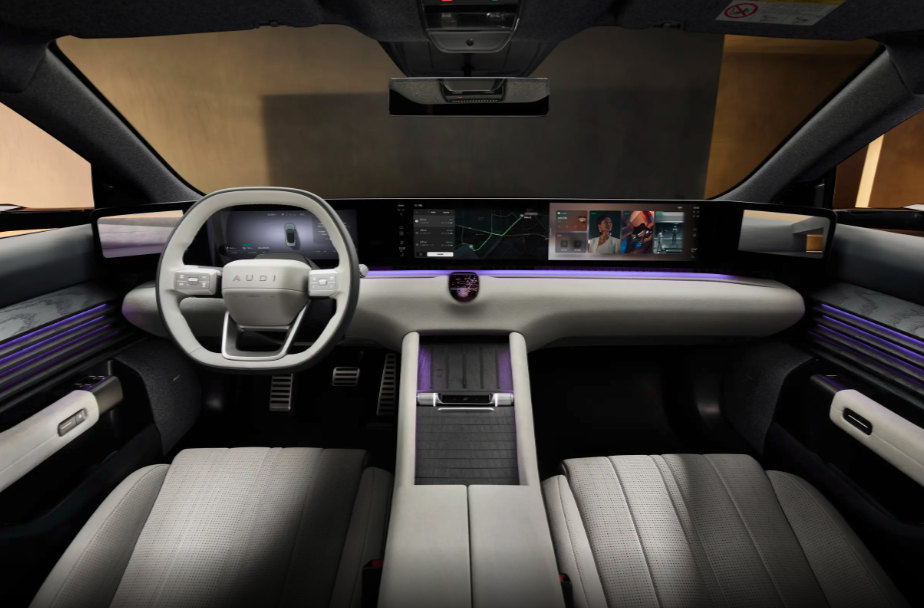 既然外观设计都这么拉风帅气了,奥迪E5 Sportback的内饰设计布局又怎能落下,打造了一个简约而富有科技感的风格,大联屏直接贯穿整个中控台,中间位置搭载一个比较特殊的触控面板,官方将其称之为情感旋涡,本质上就是一个语音助手,类似于蔚来NOMI这样的存在,可以跟用户进行互动,提供一定情绪性价值。