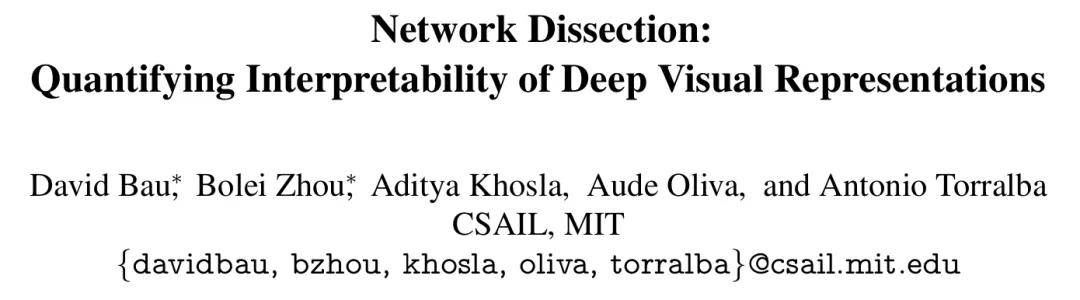 在 CAM 的基础上,他进一步提出了网络剖析(Network Dissection)的研究,该方法能够自动识别和量化神经网络中单个神经元所代表的语义概念 。这使得研究者不仅能解释单次决策,还能理解整个模型内部知识的表征方式。