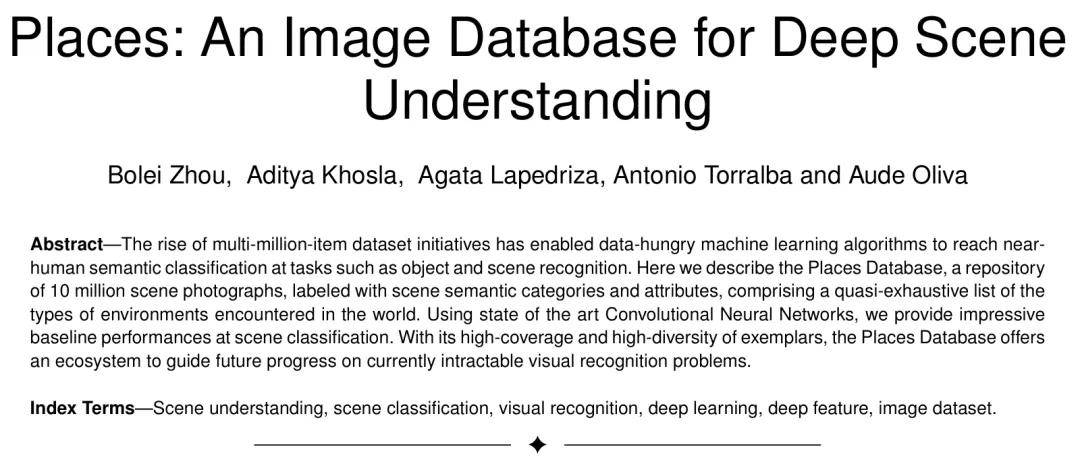 论文标题:Places: An Image Database for Deep Scene Understanding 论文地址:https://arxiv.org/abs/1610.02055 项目主页:http://places2.csail.mit.edu/index.html