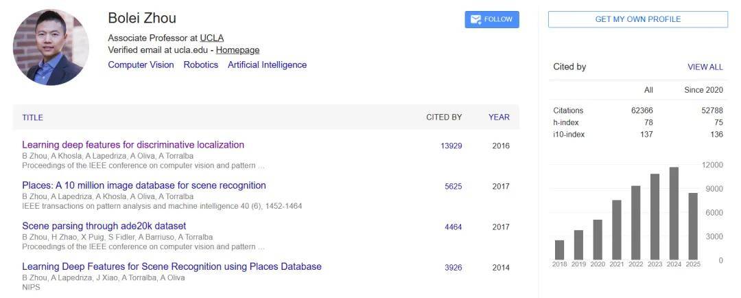 他在人工智能顶级会议和期刊发表了百余篇学术论文,论文总引用数超过 6 万次,其中一篇一作论文引用接近 14000 次。他在可解释性机器学习和场景理解等课题上有突出成果,主要成果包括 Class Activation Mapping (CAM)、Network Dissection、Places、ADE20K。