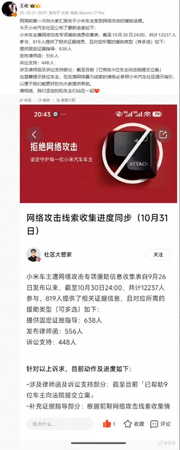 DoNews11月1日消息,今年 9 月 26 日,小米官方在小米汽车社区发文 ——《拒绝网络攻击,坚定守护每一位小米汽车车主》,提到有受过网络攻击的车主,可以留下自己的信息,一起拿起法律武器保护自己。