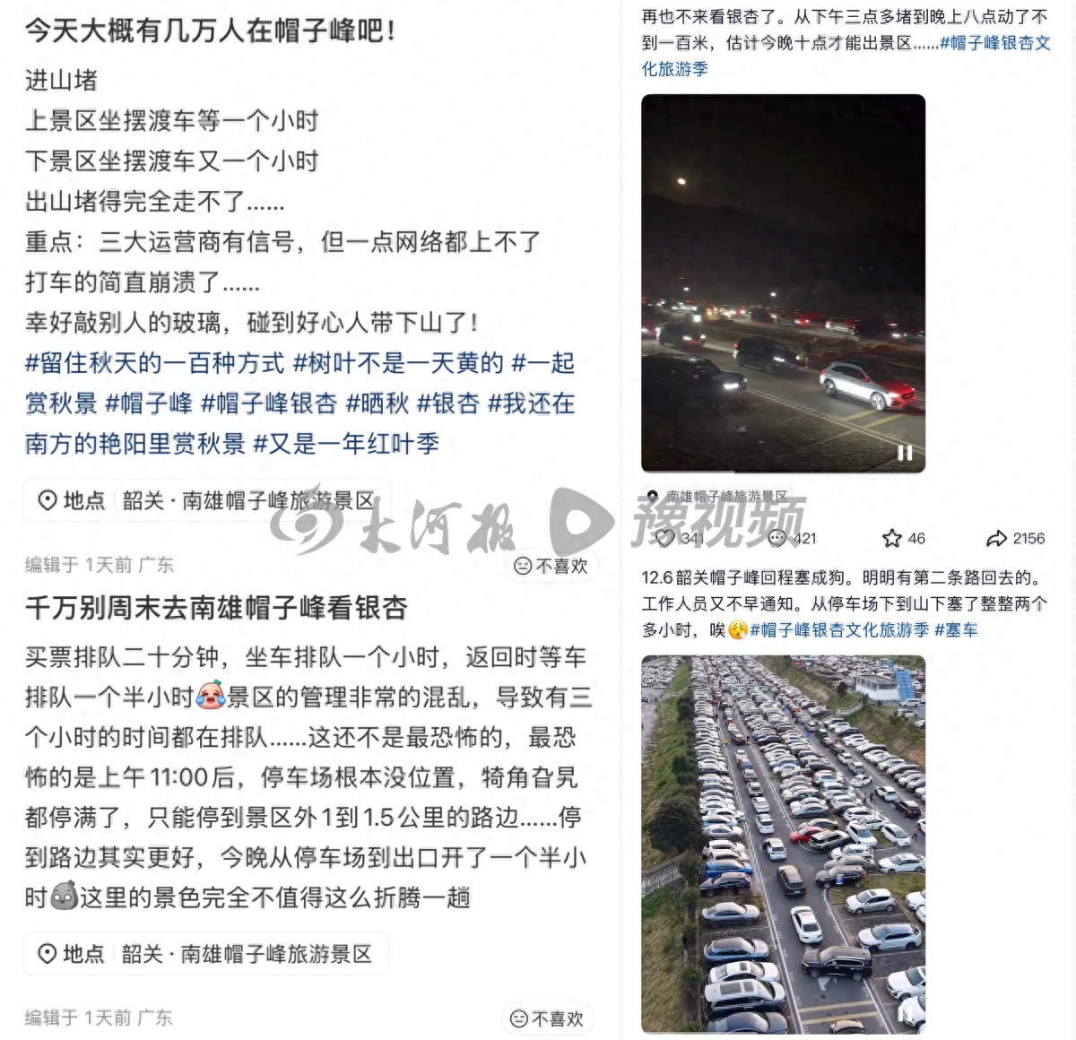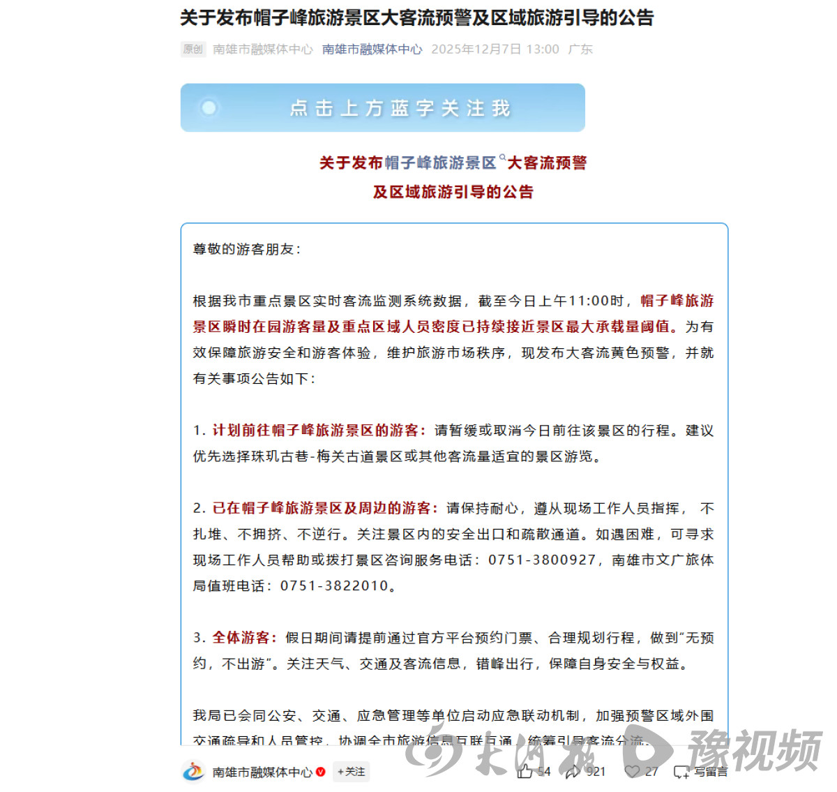 记者了解到,为应对大客流,南雄市融媒体中心已于12月7日发布黄色预警,称帽子峰旅游景区于当天上午11:00时,景区瞬时在园游客量及重点区域人员密度已持续接近景区最大承载量阈值。建议计划前往的游客暂缓或取消行程。同时呼吁游客遵从现场指挥,提前通过官方平台预约门票,尽量选择工作日错峰出行。
