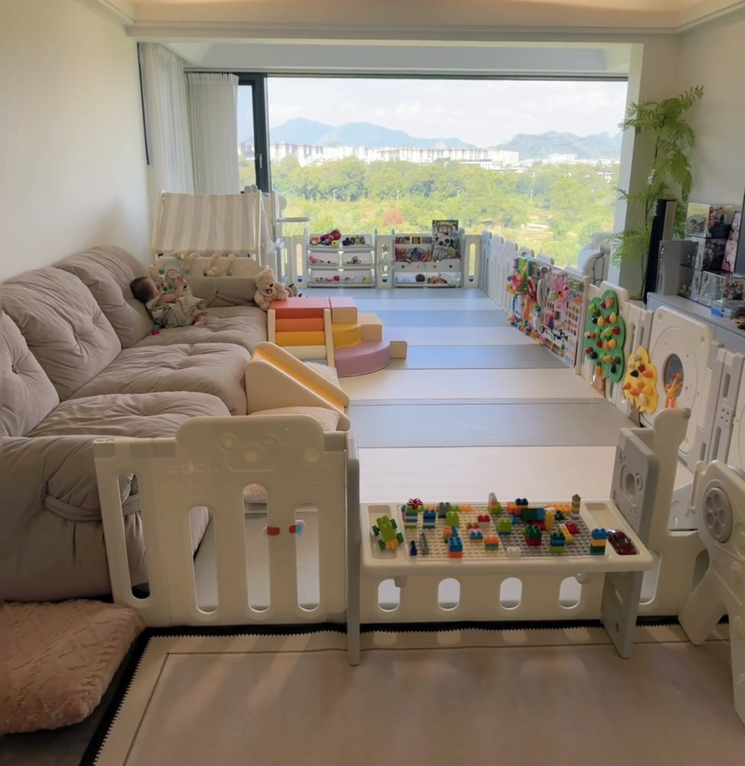 还记得装修时憧憬的客厅吗?那个放着优雅沙发、铺着精致地毯,午后阳光洒进来,你端着咖啡享受悠闲时光的地方。如今,它可能已经变成了另一个模样——色彩斑斓的爬爬垫占据了中心,游戏围栏成了最醒目的“家具”,角落堆着绘本和玩具,曾经的咖啡桌早已为宝宝的安全让路。