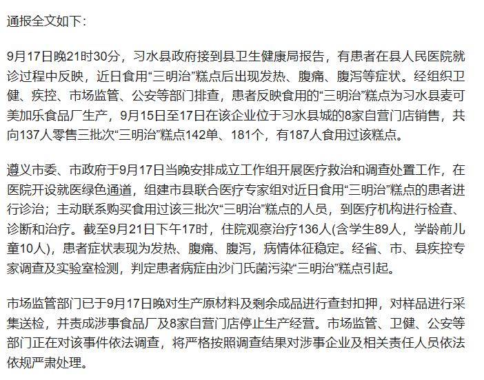 9月21日,贵州遵义习水县通报了一起食品安全事件:当地一家名为“麦可美加乐”的连锁蛋糕店生产销售的火腿三明治,导致136人出现中毒症状并住院治疗,其中大部分是学生和儿童。