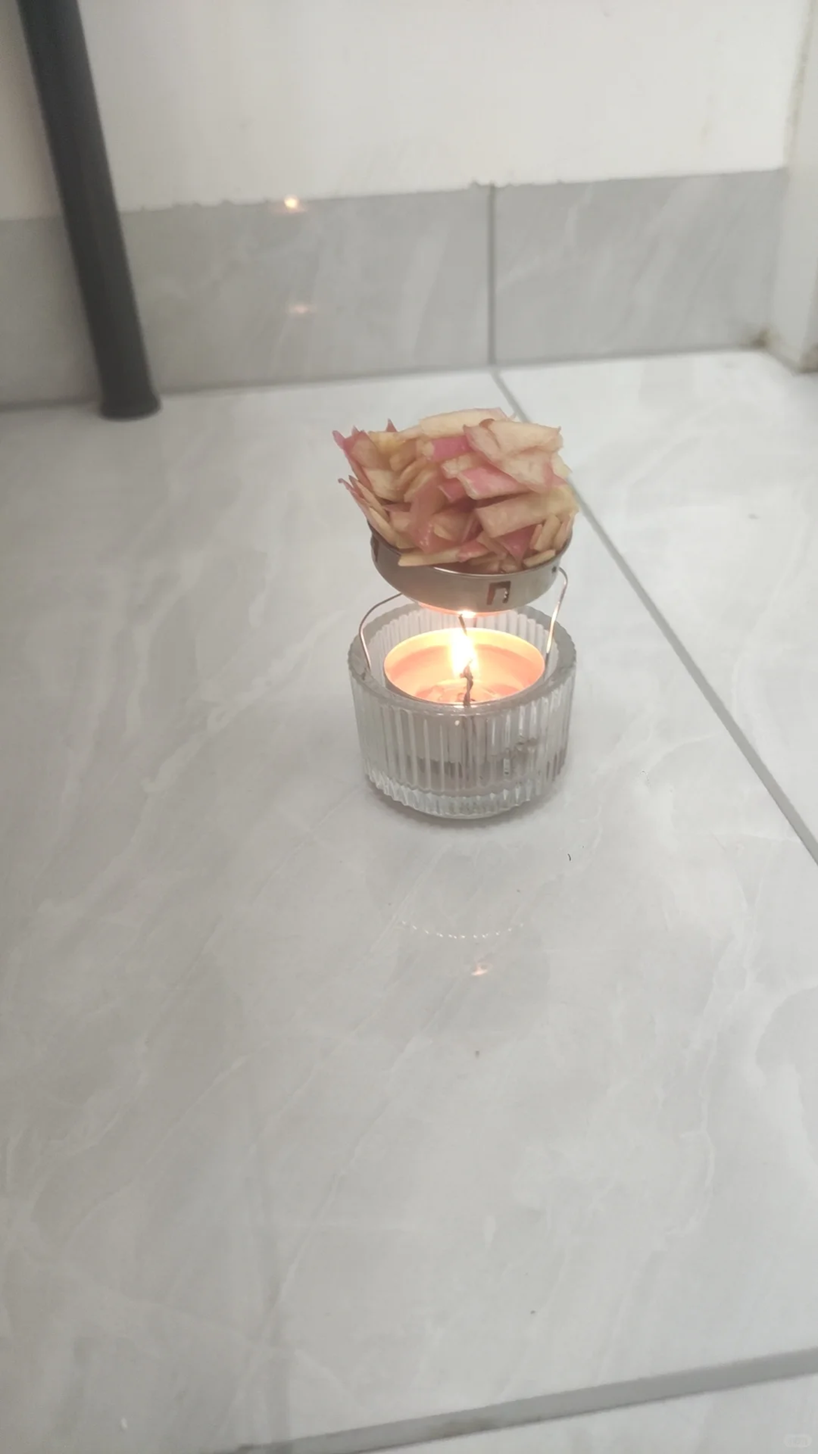 苹果皮切碎之后放进自制的熏炉当中,这样在点燃蜡烛之后,屋子里面就会有一股暖暖的苹果味了,非常的舒服,