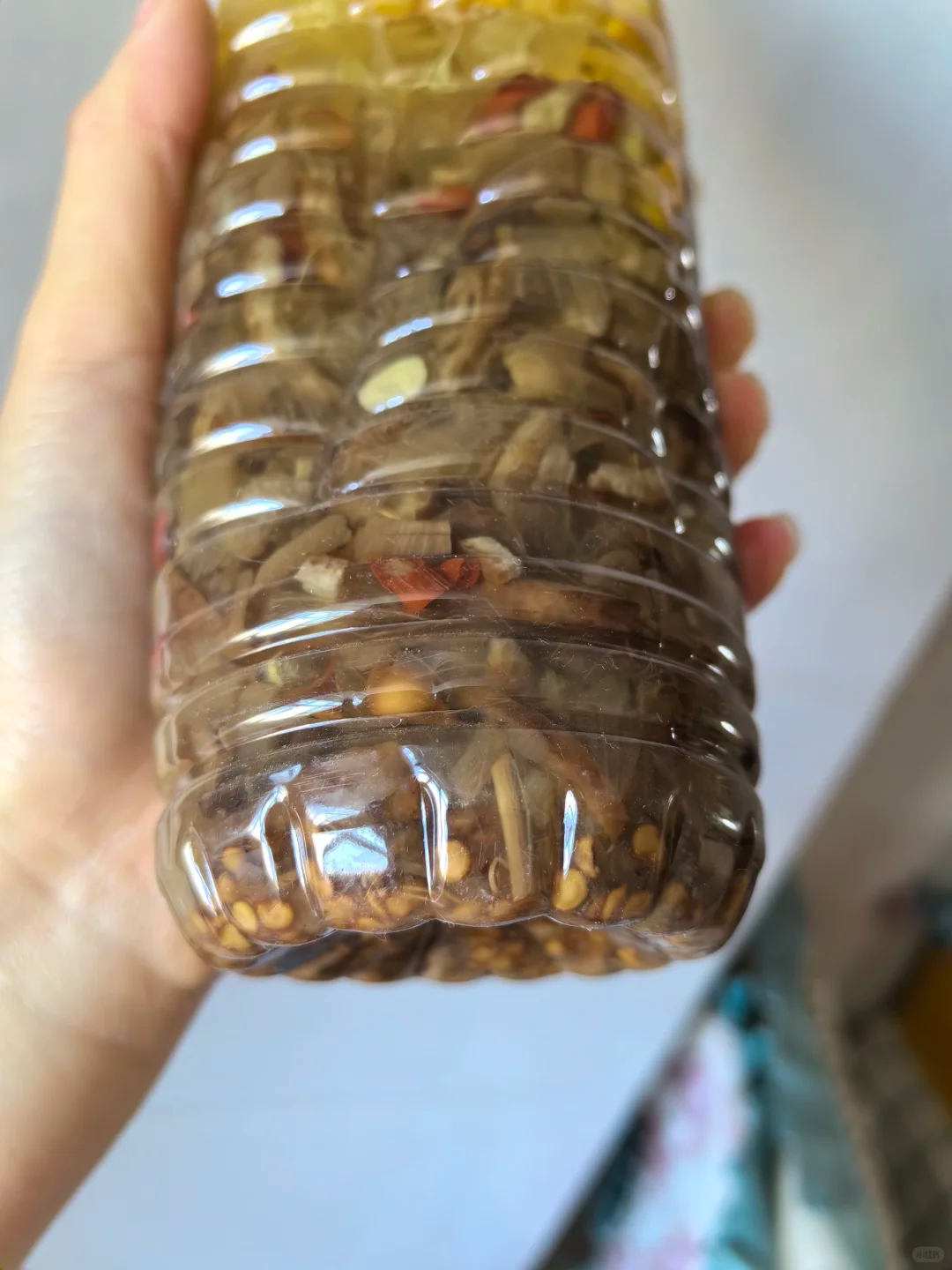 将准备好的果皮以及果肉全部放进塑料瓶当中,一般装到瓶子的1/一到三/3左右就可以了,然后再加入适量的清水或者是淘米水,开始进行发酵。