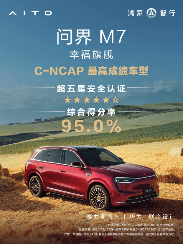 3月20日,中汽中心汽车测评管理中心(简称“中汽测评”)正式公布最新C-NCAP测试结果。“国民SUV幸福旗舰” 问界M7以95%的综合得分率荣获C-NCAP(2024版)超五星安全认证,成为C-NCAP(2024版)最高成绩车型,彰显出卓越的安全性能。