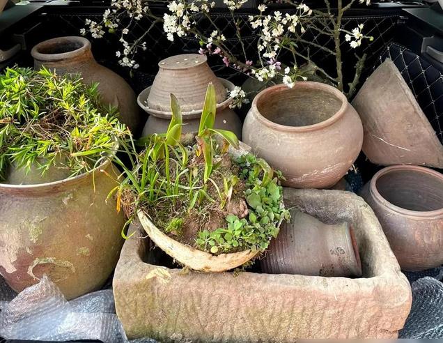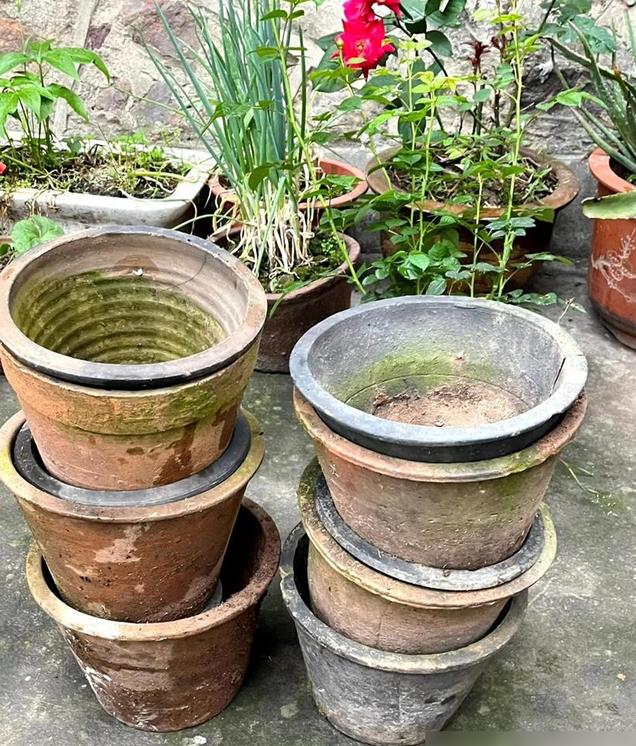 这些陶盆可以通过清洗和消毒的方式,去除原来的泥土和病虫害, 再用水泥、砂浆等材料对其进行重新处理,然后就可以用于新的植物种植了。