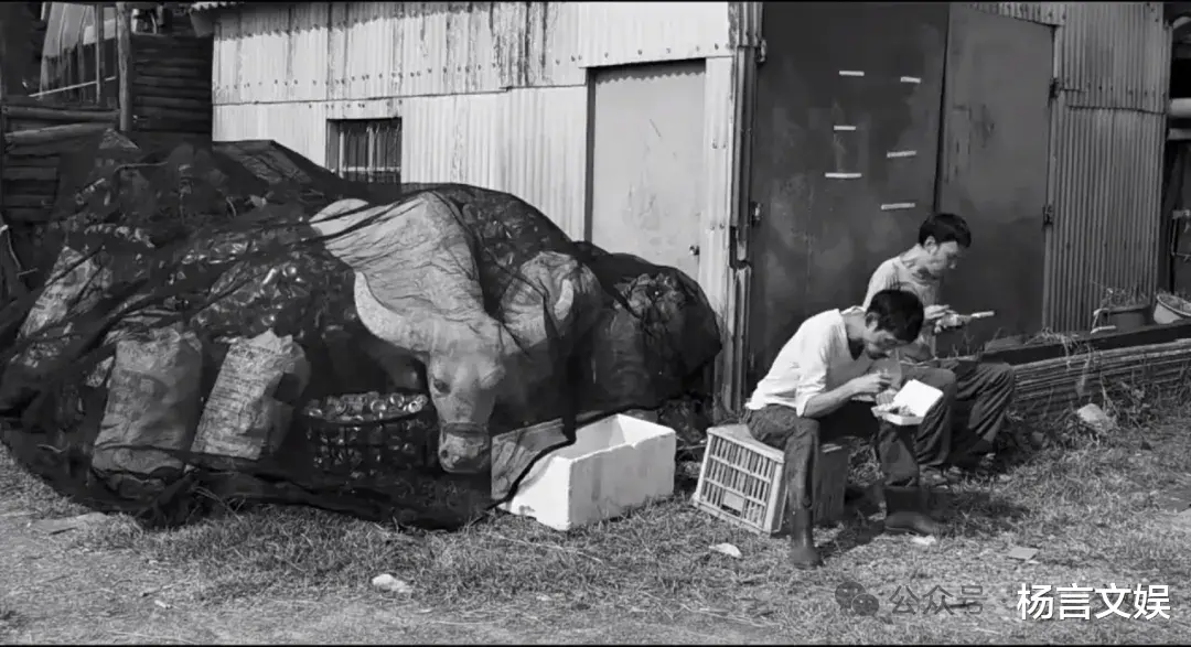 这种色彩政治学在工厂流水线的场景达到极致:流水线上机械臂喷绘佛像金身的镜头,与肚财在垃圾场分拣废品的场景交替闪现。金色颜料在机械程序里精准覆盖泥胎的过程,恰似金钱与权力对人性本质的系统性覆盖。当大佛完成最后一道工序时,流水线工人褪去工装重回黑白世界,完成了阶层身份的再次确认。