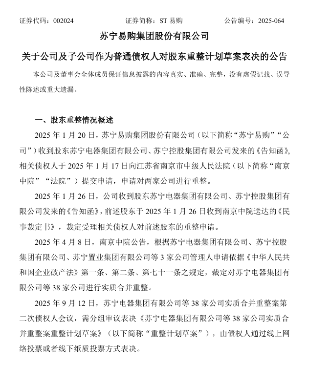 11月15日,苏宁易购集团股份有限公司发布关于公司及子公司作为普通债权人对股东重整计划草案表决的公告。苏宁电器集团等38家公司实质合并重整草案表决期被再次延期至12月14日,这是自10月17日以来的第二次延期。重组草案显示,这些公司面临超2300亿元的债务,而资产清算价值仅410亿元,严重资不抵债的现状使得普通债权清偿率预计仅3.5%。
