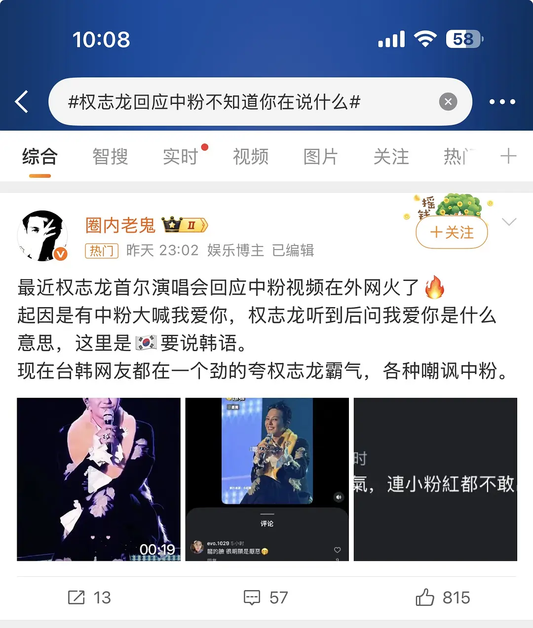 最近,一段权志龙在首尔演唱会的视频在外网火了。事情起因相当简单:台下有中国粉丝用中文大喊“我爱你”,而舞台上的权志龙在听到后,先是反问“不知道你在说什么,我爱你是什么?”,随后补了一句“这里是韩国”,并最终用韩语说了“撒浪嘿”(사랑해,意为“我爱你”)。
