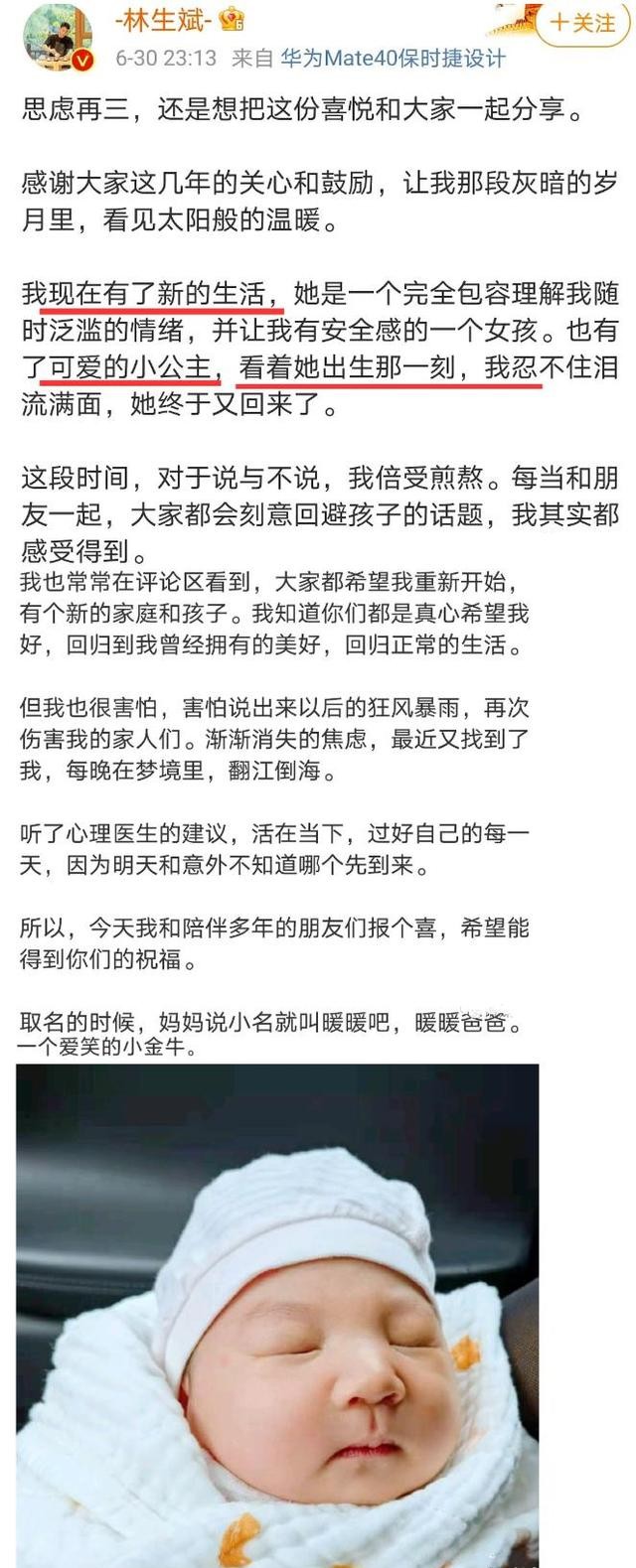 眼看消息藏不住,林生斌不得已,发了微博小作文,还口口声声宣扬是和网友们分享喜悦。