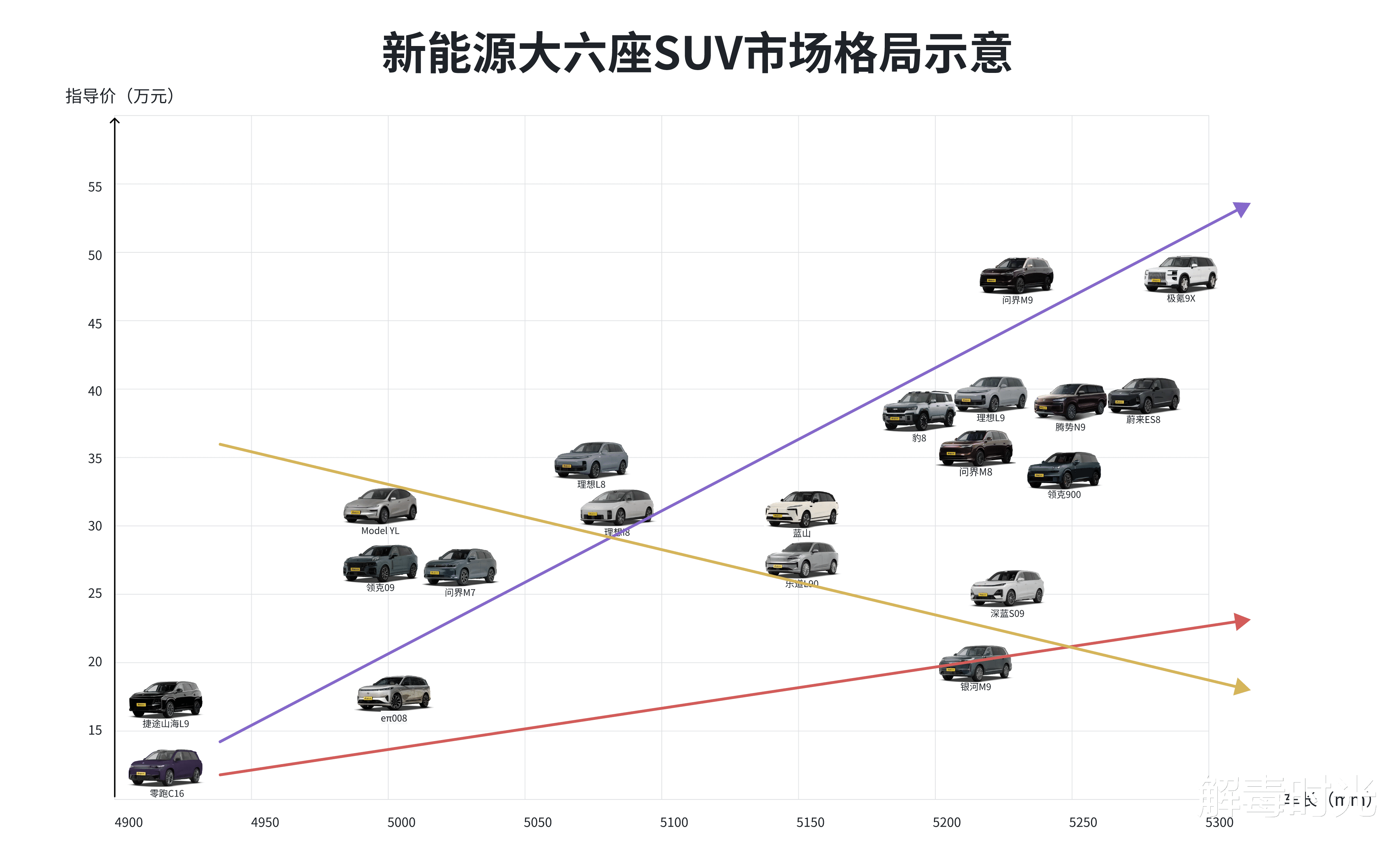 再拿一个更加细分的市场,也是今年特别流行的新能源大六座SUV市场来看。市场围绕着正比线展开,从零跑C16到极氪9X,这条线周围的产品相对来说比较主流。零跑C16和银河M9又构筑了这个市场的底线。同时又是特斯拉,它的Model YL拉出了这个市场的一条反比线,总的来说,反比线的存在,就意味着这个市场一定有先发产品或价值更高的品牌存在。