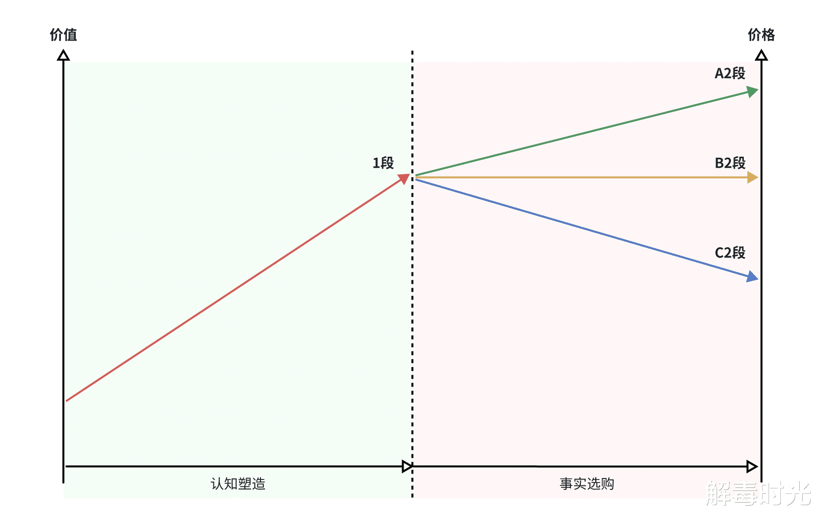 如果将价格、价值以及认知和事实统筹在一起看的话,我们可以得到一个两阶段的市场模型。任何一个产品的GTM首先要经历一个认识塑造的阶段,即通过营销拉升用户对产品的认知价值,而进入第二个阶段用户事实选购的时候,就可能出现三种情况,购买价格高于、等于或低于认知塑造出来的价值。