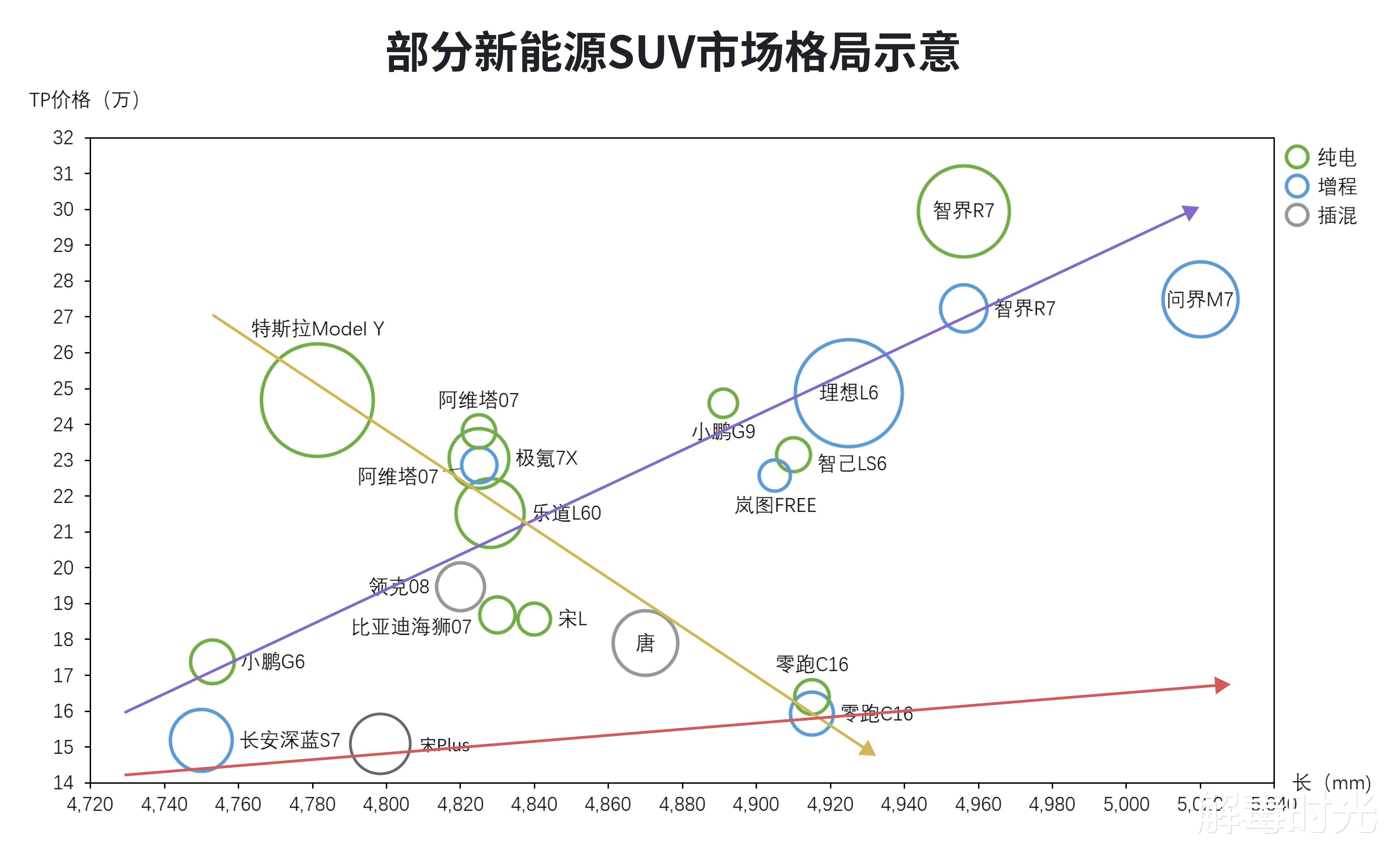 更有助于我们分析的是正比线、反比线和底线。其中正比线比较舒展,也符合大部分认知,即车越大,价格应该越贵,这一条线上的产品从小鹏G6开始,到智界R7,都是市场上性价比较为均衡的产品,也可以称之为主流产品。有趣的反比线,在这儿市场就出现了——左上角的特斯拉非常明显,随之像右下眼神,有一大批车都是冲着特斯拉Model Y去,用更大的车身,更便宜的价格想要争取特斯拉的份额,这条线一直延伸到零跑C16。线上的每一款产品都是对其左上产品的冲击。