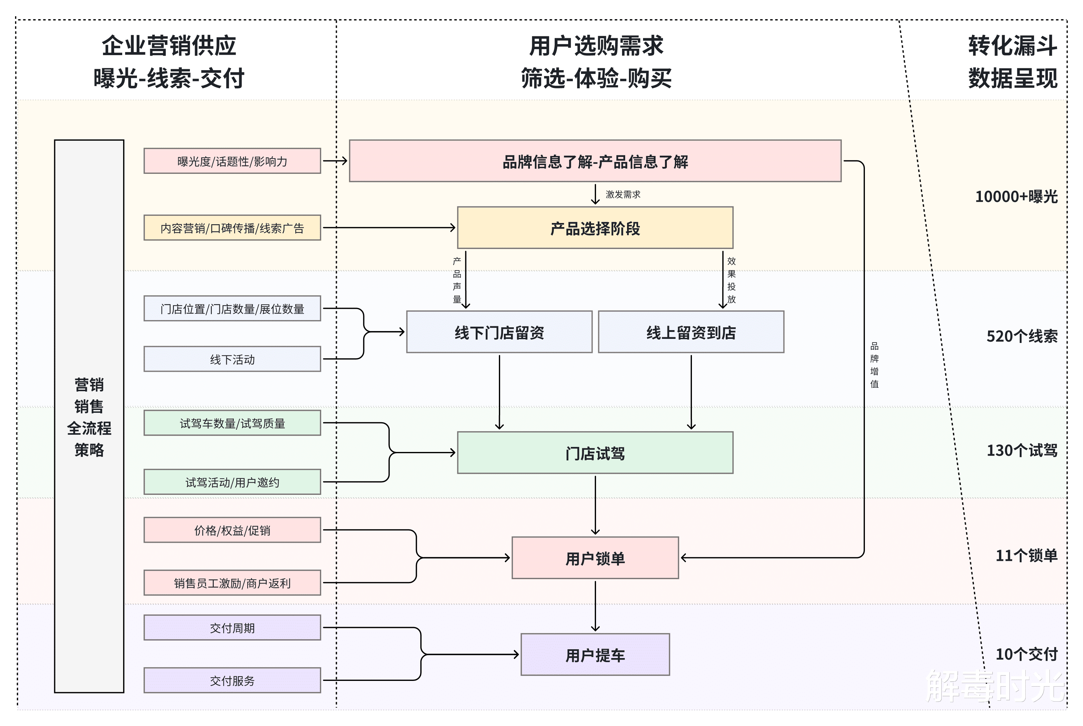 这其中,最关键的是二者都是一个“过程”。以汽车行业为例,认知来自于品牌营销的曝光、产品的内容和口碑的传播以及直达的效果类广告以及门店的讲车和试驾体验过程。事实的购买不仅仅是预定这个动作,还要包括后续的交付、服务用车体验和口碑产生等等。