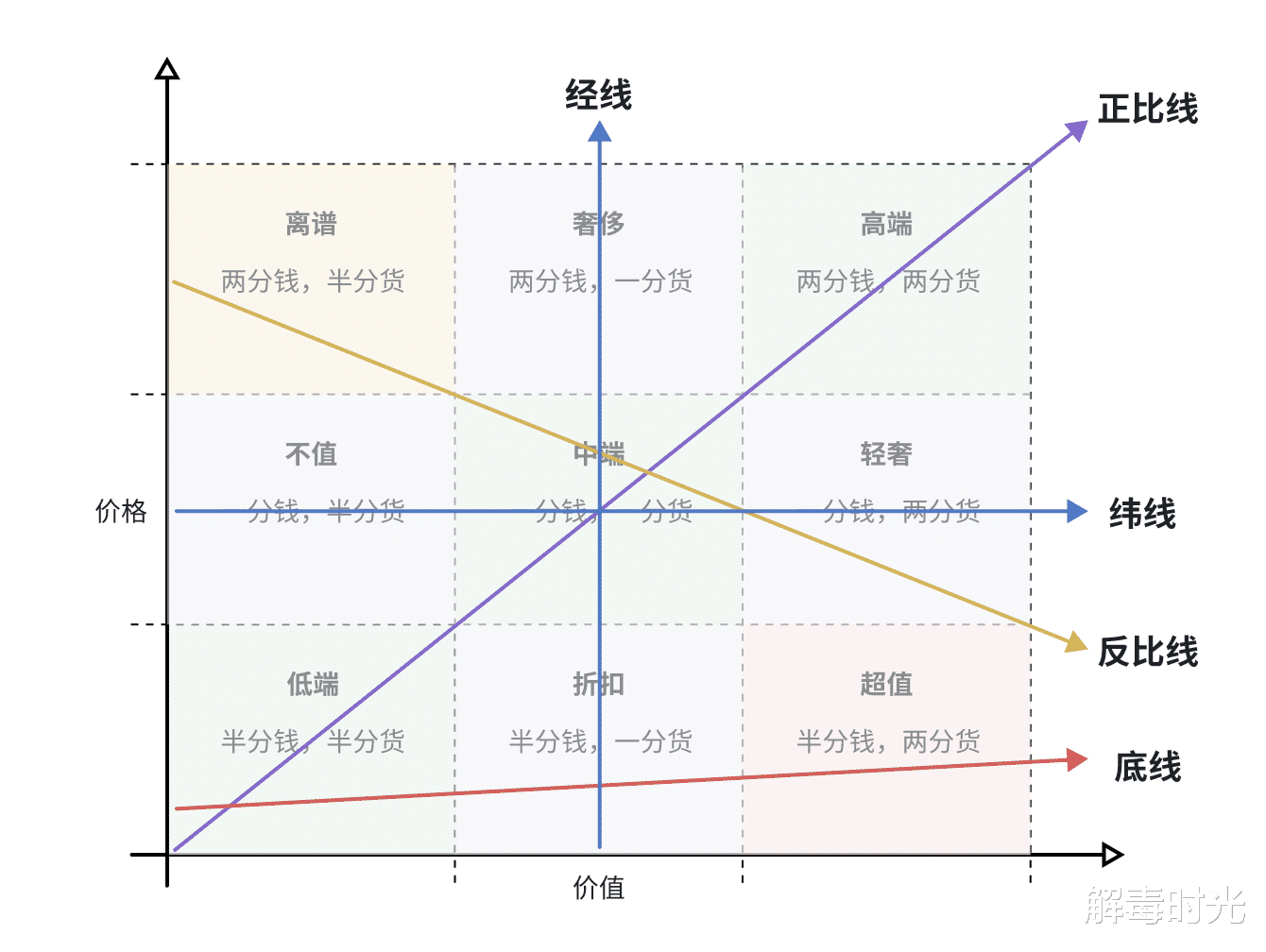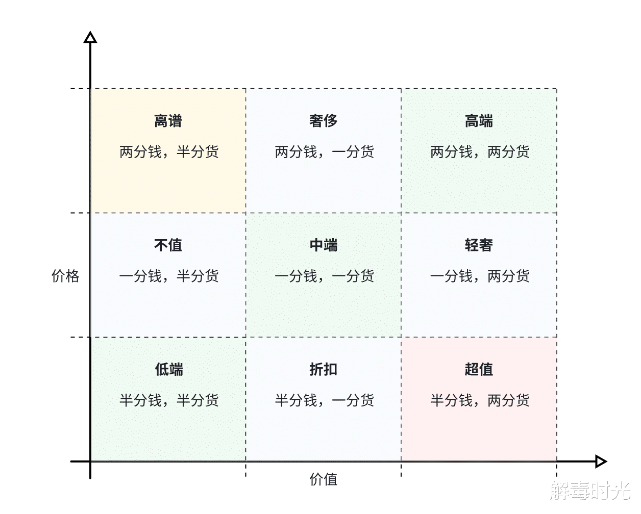 首先用最简化的九宫格,可以勾勒出一个价值和价格之间的对应关系。用“一分钱,一分货”作为等价交换的中值,代表了中端产品,中端产品的左下和右上分别是“半分钱,半分货”的低端产品和“两分钱,两分货”的高端产品。围绕着中端产品的上下左右,分别是上面的奢侈品“两分钱,一分货”,下面的折扣品“半分钱,一分货”,左边的不值得产品“一分钱,半分货”和右边的轻奢产品“一分钱,两分货”。
