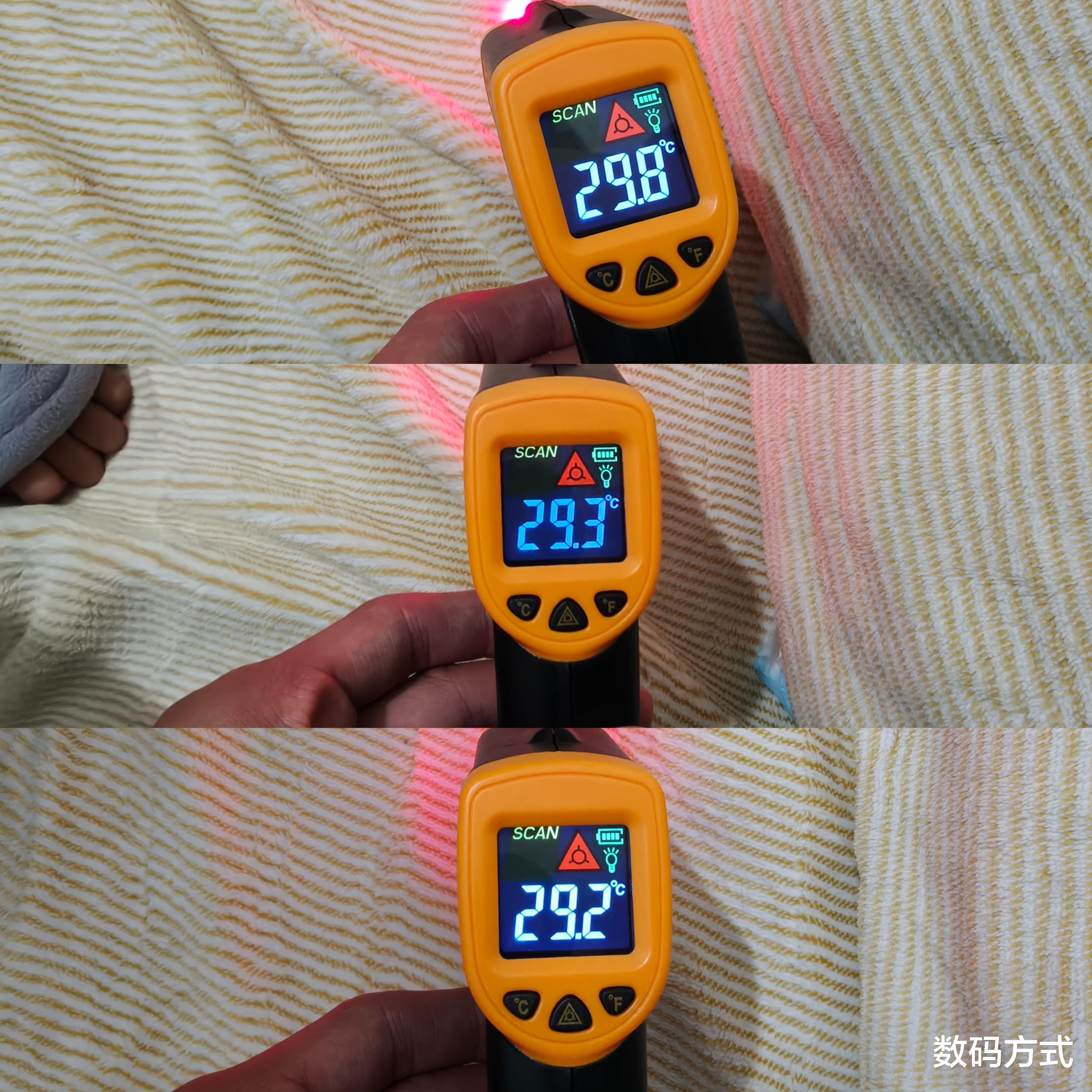 实测结果:可以看到1分钟左右以后: 毯面温度已达来到了二十多度,能明显感觉到暖意。用红外测温枪测试宫菱电热毯的几个部分温度分别为29.8℃、29.3℃、29.2℃,可以说这个温差控制很小了,也可以直观反应出这个水暖毯不仅加热快、加热也比较均匀。