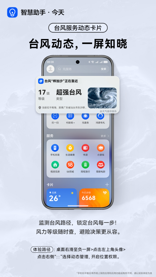 对了,最近这几个月还是台风季,特别是这次的超强台风“桦加沙”让广东多地“如临大敌”。建议大家在前往南方省份游玩之前,先在服务动态卡片区开启台风预警,点击卡片还能查看台风路径等信息。这样就能随时了解台风的最新动向,提前安排行程,避免台风天影响你的旅行好心情。