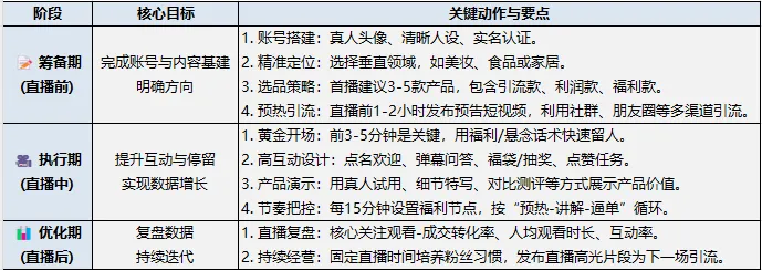 对于抖音直播从0到1起号,核心在于精准定位、内容预热、高互动直播和持续复盘优化。下面这个表格汇总了起号各阶段的核心任务,你可以一目了然地掌握全局框架。