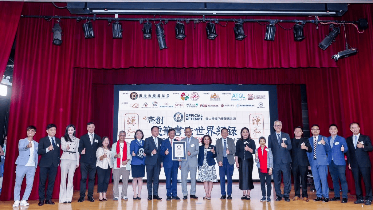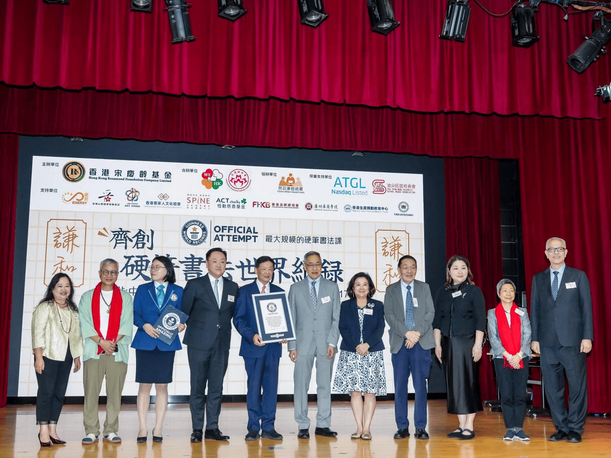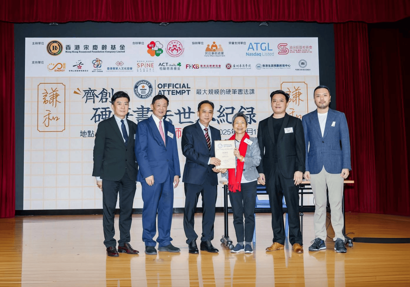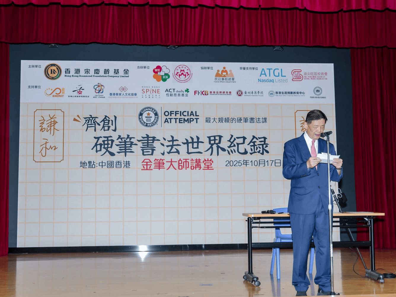 香港 — 2025年10月17日,梁显利油麻地社区中心洋溢着浓厚的文化氛围与青春活力。由香港宋庆龄基金、We Like Hong Kong、沪港妇女会主办、民政事务总署协办的“金笔大师讲堂——齐创硬笔书法世界纪录”活动在此隆重举行,来自香港油尖旺区多间中、小学的291名学生齐聚一堂,以笔墨寄情、以书法传意,顺利完成一场意义非凡的硬笔书法课,成功挑战并创下“最大规模硬笔书法课”健力士世界纪录TM,为庆祝中华人民共和国成立76周年,献上一份蕴含中华文化底蕴的珍贵礼物。由中联办教育科技部叶水球副部长、香港特别行政区政府油尖旺民政事务专员余健强先生担任活动主礼嘉宾。