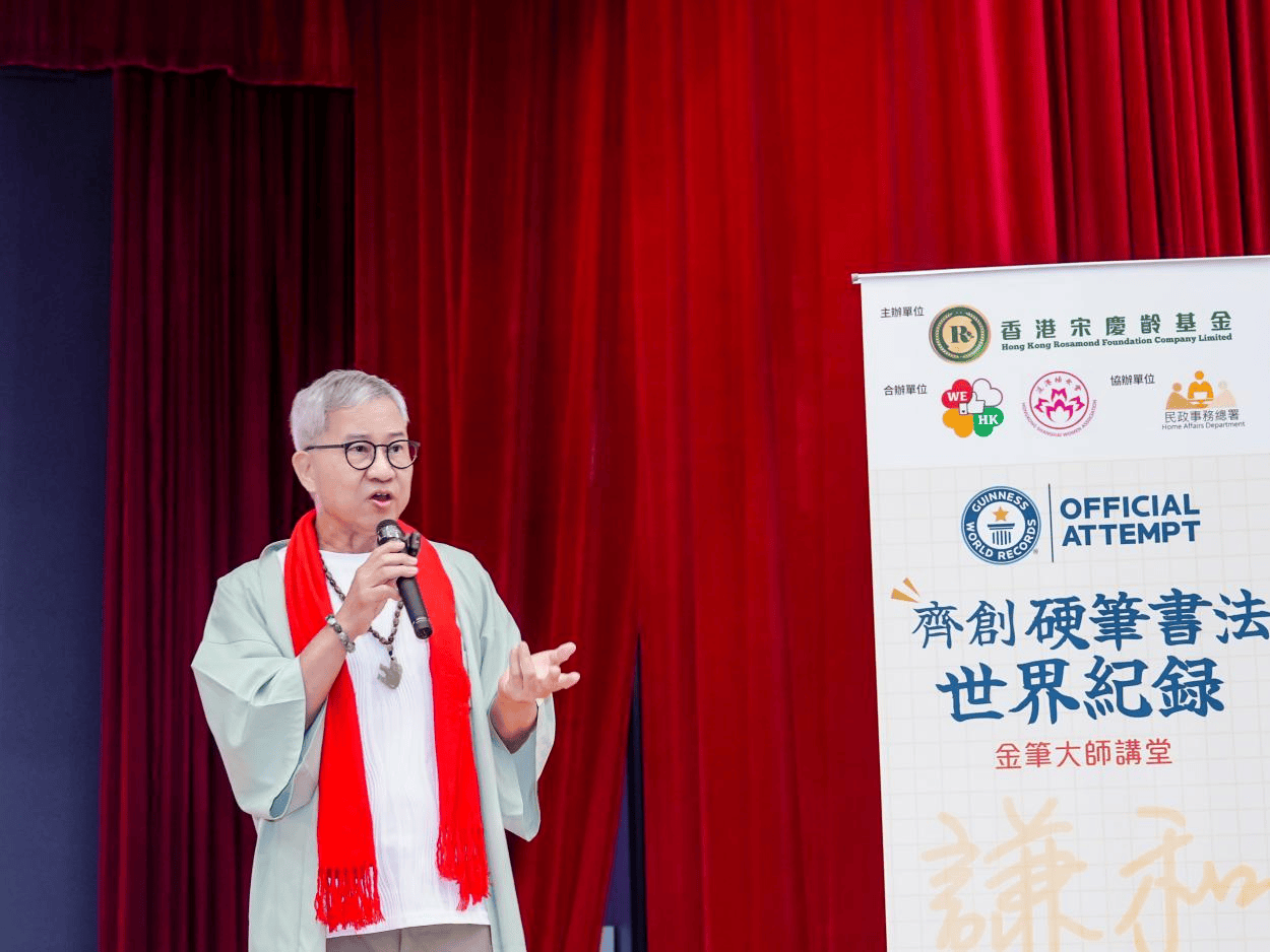 当日下午2时,伴随着现场师生的期待,活动正式拉开帷幕。香港特别行政区政府油尖旺民政事务专员余健强先生致词,他高度肯定本次活动对弘扬中华文化、推广书法艺术的重要意义,强调书法不仅是文字的艺术,更是文化传承的载体,鼓励学生们珍惜机会,在笔墨间感受传统文化的魅力。随后,香港宋庆龄基金创会会长、港区全国人大代表胡晓明教授表示这次透过创新世界纪录,香港青少年有机会为香港发放更多正能量,并在国际社会推广中华文化,让世界认识及了解中国。他并表达对进一步弘扬中华文化、促进青少年全面发展的殷切期望。