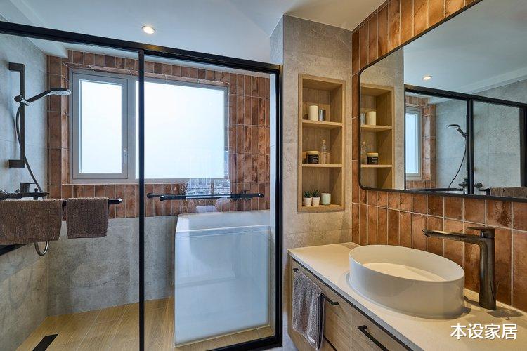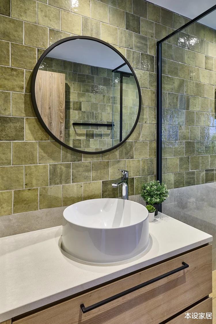 主卫和次卫的地面铺设木纹砖,墙面分别使用抹茶绿和咖色墙砖,黑框超白玻璃隔断作区域划分,干净卫生。而洗漱台抽屉柜、淋浴房的壁龛和马桶后的收纳柜,都能让洗漱用品和清洁用品得到整齐的收纳。