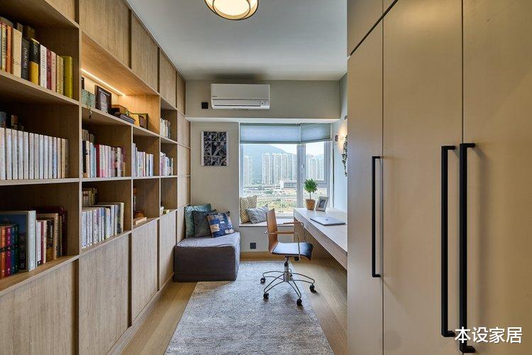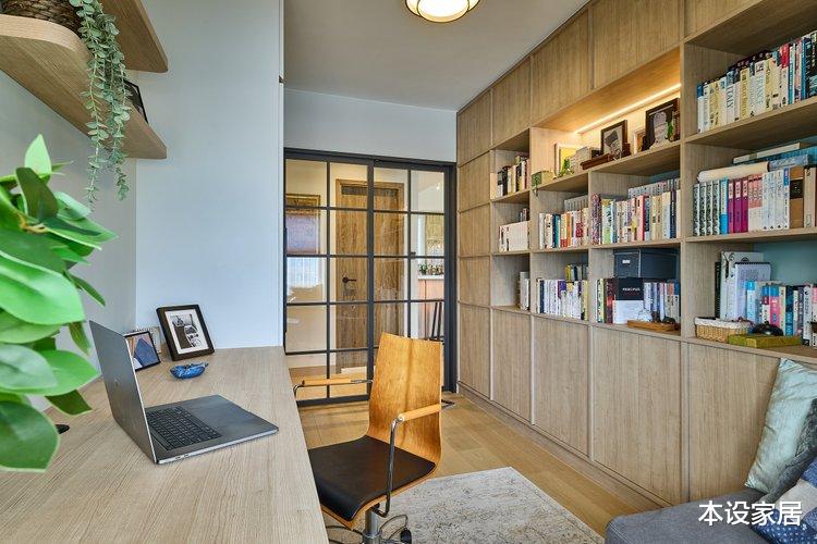 书房同样采用金属框玻璃移门,书柜和书桌靠两边墙布置,视线通透,也可以给走道补光。