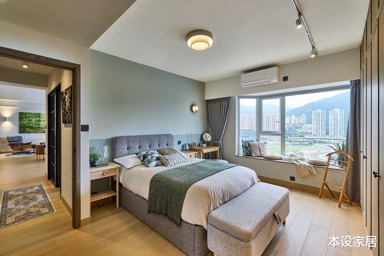 主卧进门左侧是卫生间,床头背墙刷分段薄荷绿漆,搭配同色系的床品,带来一份清新和沉静的氛围。在他们看来,家本就该拥有不被定义的呼吸感。