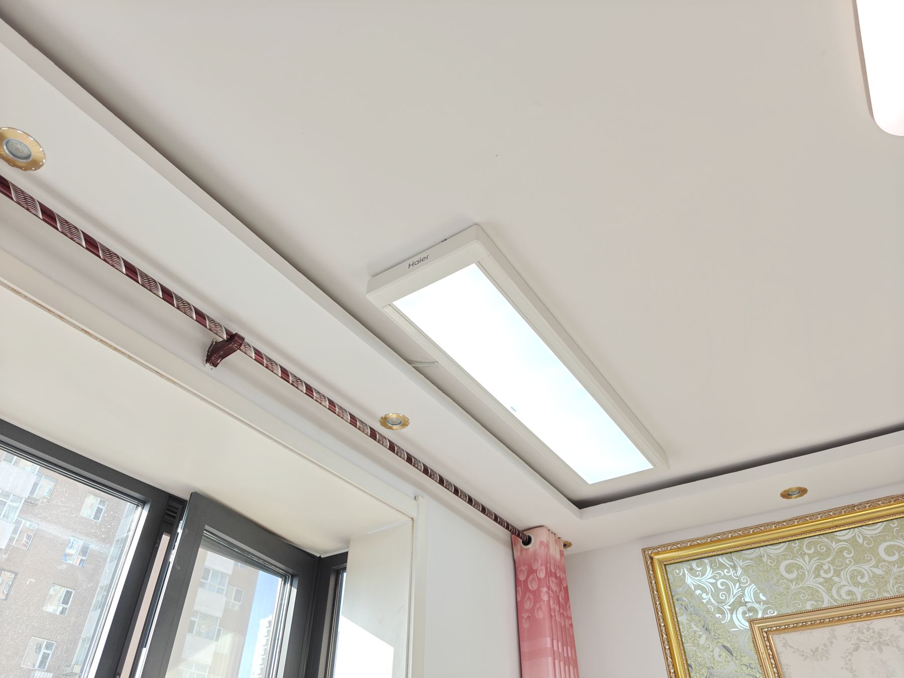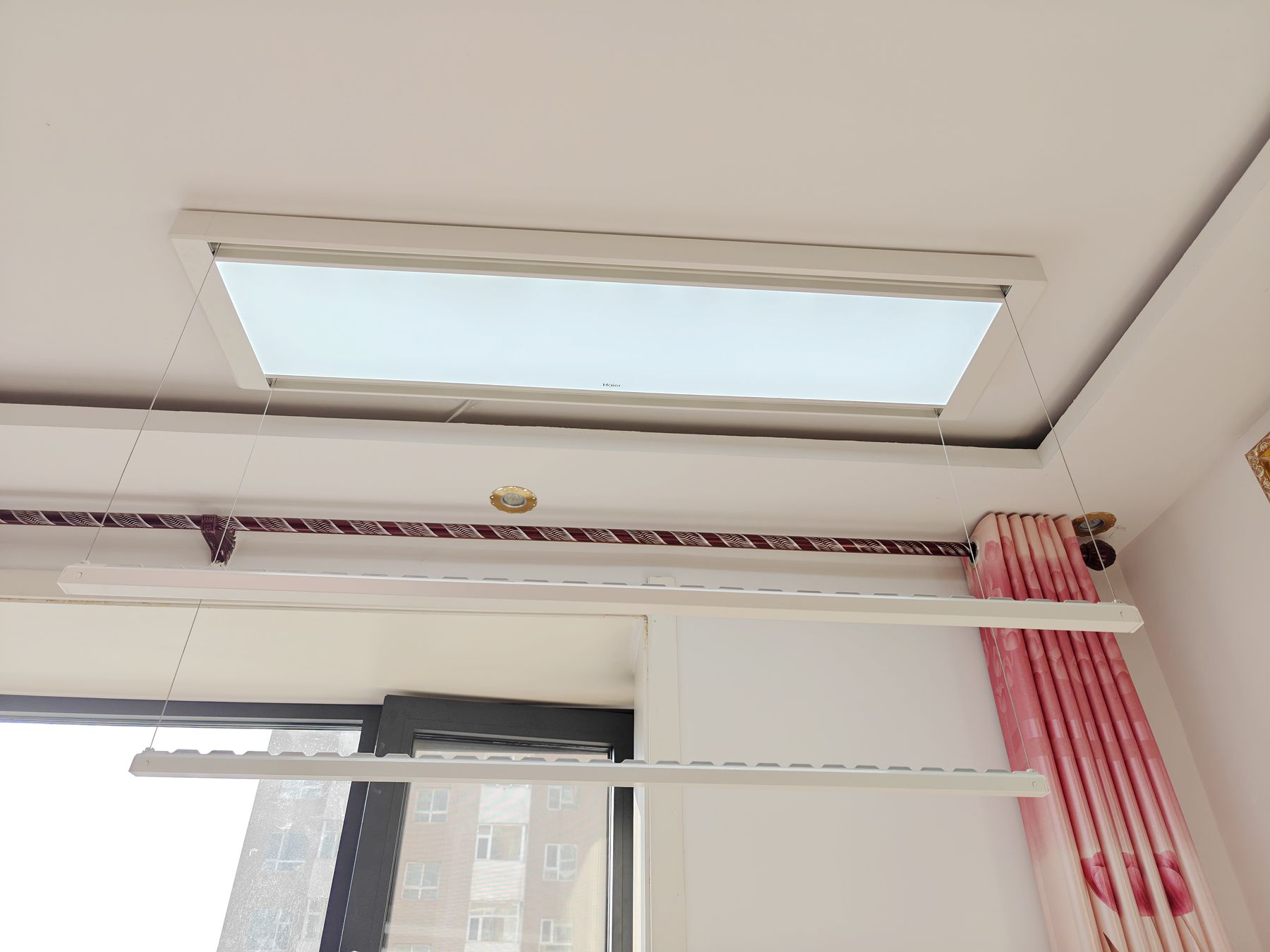 如果到了晚上不晒衣服的时候,就打开照明功能,这款海尔 YL05S 智能晾衣机,配备 24W 大屏护眼照明,采用精选的 LED 节能灯珠,全屏发光,光线均匀柔和无暗区(可对比上图中晾衣机灯与客厅灯的区别,高下立见),无可视频闪,不仅满足晾晒衣物时的照明需求,还能为阳台提供舒适的照明环境。