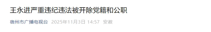 王永进严重违反党的廉洁纪律,构成严重职务违法并涉嫌受贿犯罪,且在党的十八大后不收敛、不收手,性质严重,影响恶劣,应予严肃处理。依据《中国共产党纪律处分条例》《中华人民共和国监察法》《中华人民共和国公职人员政务处分法》等有关规定,经泗县纪委常委会会议研究并报县委批准,决定给予王永进开除党籍处分;由泗县监委给予其开除公职处分;收缴其违纪违法所得;将其涉嫌犯罪问题移送检察机关依法审查起诉,所涉财物一并移送。(泗县纪委监委)