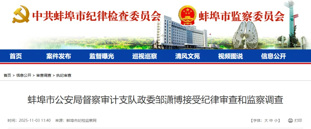 据“蚌埠纪检监察网”11月3日消息,蚌埠市公安局督察审计支队政委邹潇博涉嫌严重违纪违法,经蚌埠市纪委监委指定管辖,目前正接受五河县纪委监委纪律审查和监察调查。(五河县纪委监委)