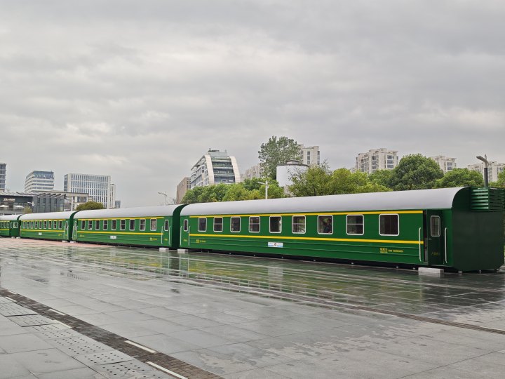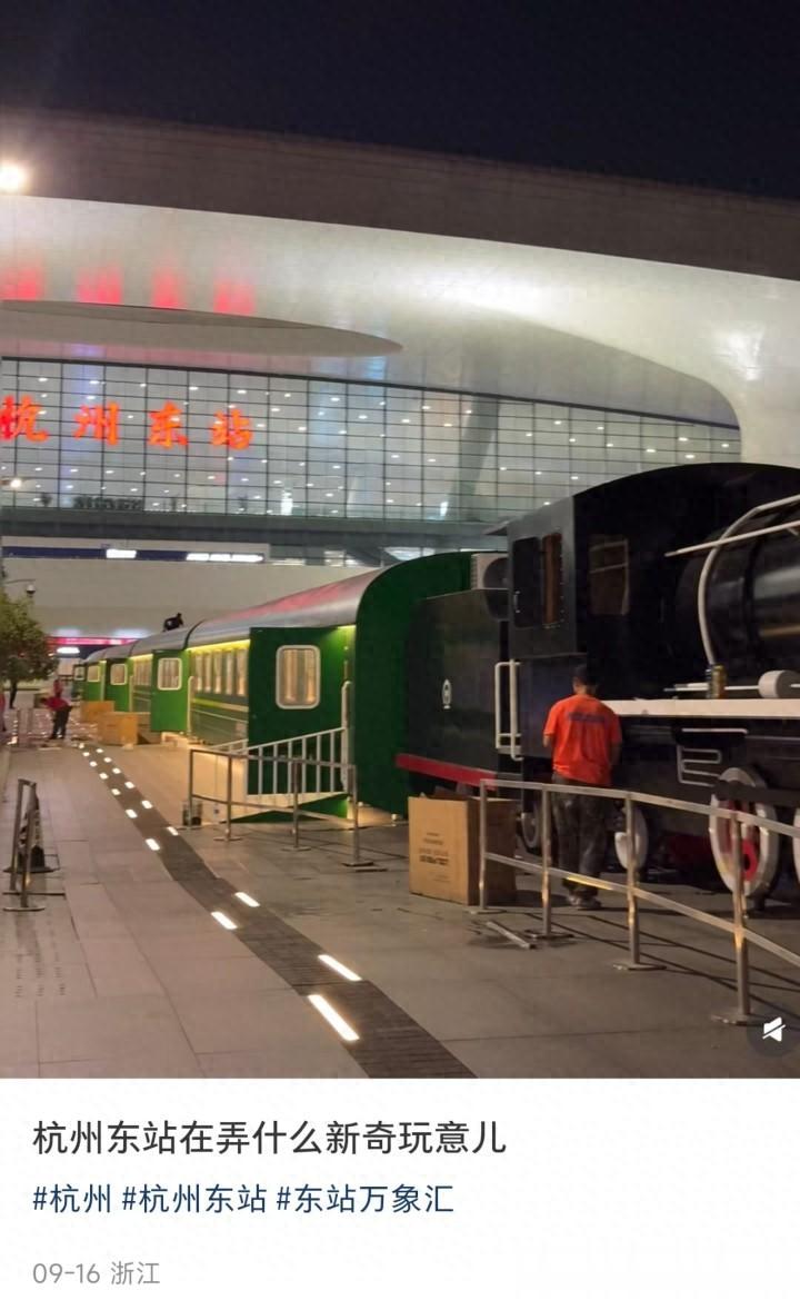 9月16日,一名网友在社交平台发布了一张图片,内容是杭州东站的东广场上停着一辆“绿皮火车”。并配文“杭州东站在弄什么新奇玩意儿”。